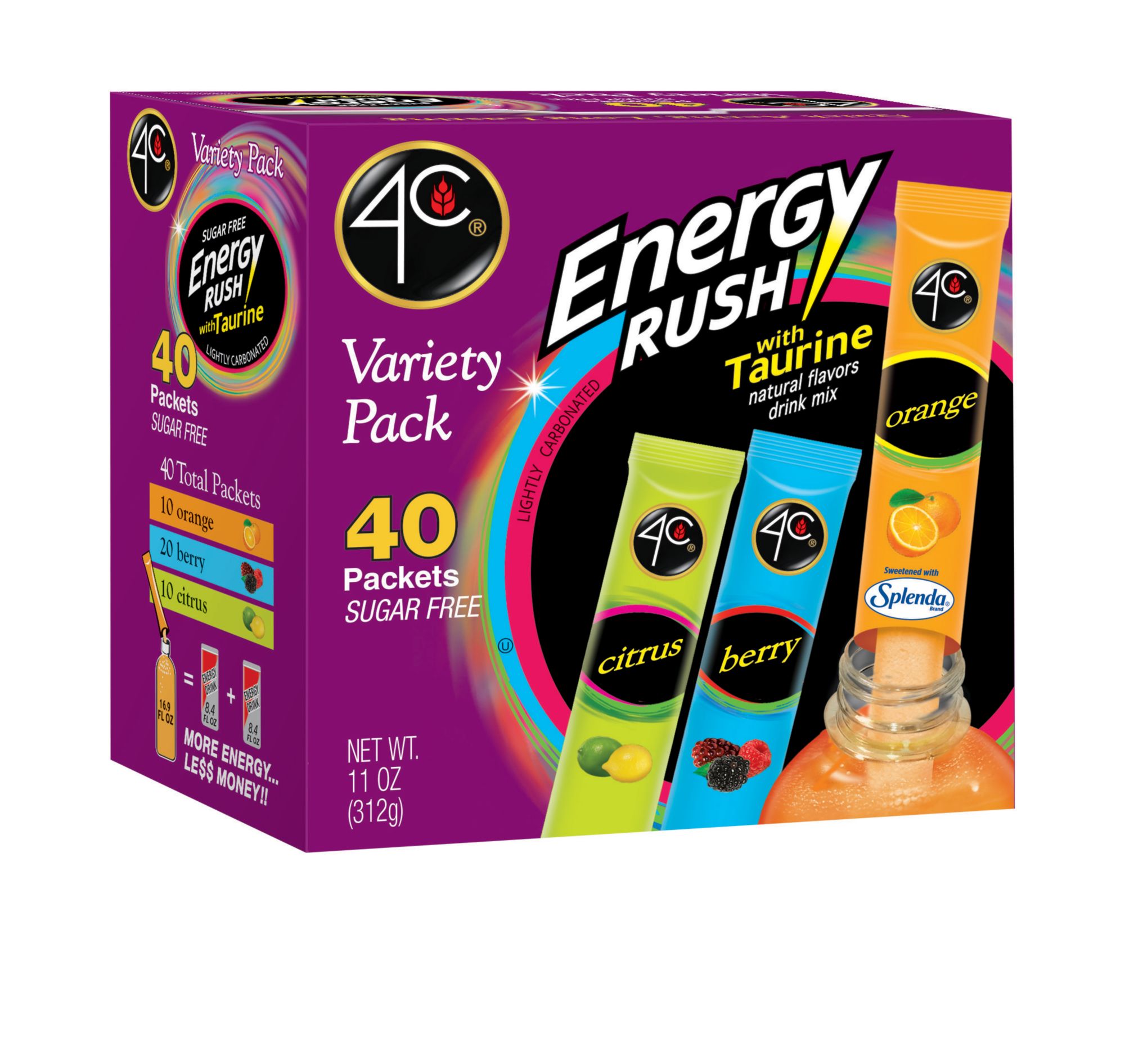 The 4C Energy Variety Pack offers 4 delicious fruit flavors: Berry, Citrus, Orange & Strawberry. 4C Energy Stix are enhanced with Taurine and Vitamin B. They’re quick acting, long lasting with no sugar crash. 4C Energy gives you more energy than the competition for less money! Product Features: Energy rushTaurineSugar freeMore energy, less $$Variety pack Ingredients: Citric Acid, Taurine, Glucurono-Lactone, Sodium Bicarbonate, Sodium Citrate, Caffeine, Acesulfame Potassium Natural (Mixed) Berry Flavors, Sucralose, Niacinamide (B3), Calcium Pantothenate (B5), Pyridoxine Hci (B6), Silicon Dioxide, Fd&C Red 40 & Blue 1, Folic Acid (B9), Cyanocobalamine (B12)