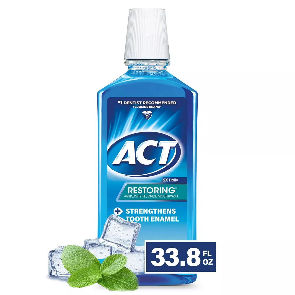 Help protect against cavities and care for your teeth to the fullest with ACT Restoring Anticavity Fluoride Mouthwash in Cool Mint flavor. This once daily mouthwash helps you go beyond brushing and flossing by strengthening tooth enamel for superior anticavity protection* and freshened breath. In fact, rinsing with ACT Restoring Mouthwash can help make teeth up to 3x stronger.*** Expect more from your mouthwash. Trust ACT, the No. 1 dentist recommended enamel strengthening brand**.