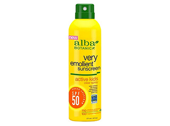 Alba Sunscreen Active Kids Continous Spray is an aerosol-free, air-powered continuous spray that can be sprayed at any angle, is water resistant (80 minutes), tear free, and has 100% vegetarian ingredients with no oxybenzone, PABA, nano-particles, parabens, phthalates, synthetic fragrances or artificial colors.