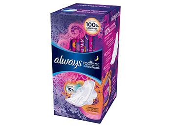 Nighttime leaks can be a nightmare! Sleep easy knowing your prettiest p.j.’s will always look like a dream with Always Radiant Overnight pads. Light, flexible Always Radiant Overnight pads are up to 100% leak-free, so you can wear what you want, any night. Always Radiant Overnight pads are made with FlexFoam that absorbs 10X its weight, which means they’ve got your back all night long?up to 10 hours. And they’re so thin and flexible, you might forget it’s even there. Always Radiant Overnight pads also have fierce, fun patterns, designed to be almost as stylish as you are. And their new, better-than-ever wing adhesive means they’ll be sure to stay put. So don’t lose sleep over leaks! Stay confident all night long in Always Radiant Overnight pads. 100% leak-free periods are possible with Always Radiant pads. Fabulous FlexFoam absorbs 10X its weight for protection you’ll forget is even there. A pad that’s almost as stylish as you are, designed with fierce, fun prints. This mighty pad has got your back?up to 10 hours of worry-free protection. Stay-put protection with better-than-ever wing adhesive. Feel fresh all night long with a light, floral scent. Always Radiant pads are available in regular, heavy, and overnight absorbencies.
