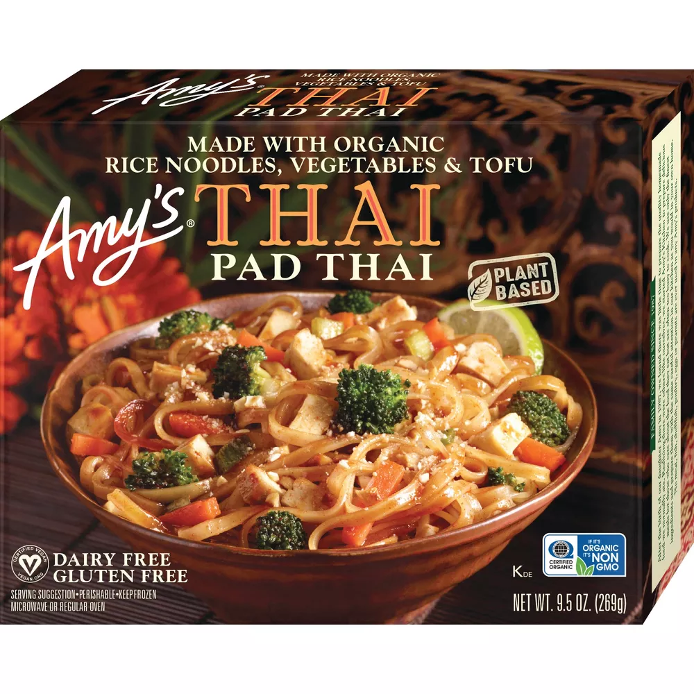 Everyone in the family will enjoy Amy s Pad Thai! Made with organic broad rice noodles, organic house-made tofu, organic julienned carrots, green onions and broccoli, this traditional dish is delicious, gluten free and dairy free. We ve also added our own twist: Baked cashews instead of the typical peanuts. This is a great-tasting way to try Thai! It s also convenient and easy to prepare, simply heat and serve. Since 1987, we at Amy s Kitchen have produced delicious, convenient foods for people who are sometimes too busy to cook. Amy s is a family-run business, and we supervise every aspect of our business and take pride in customer satisfaction. All the fruits, vegetables and grains we use are grown without the use of insecticides, GMOs and other harmful chemicals. We prepare these ingredients with the same careful attention in our kitchen as you would in your own home for high-quality, home-style vegetarian and vegan meals. No meat, fish, shellfish, poultry, eggs or peanuts are ever used in any Amy’s products. Even though you’re heating up our meals in your home, we want each bite to taste like you’re a guest in ours.
