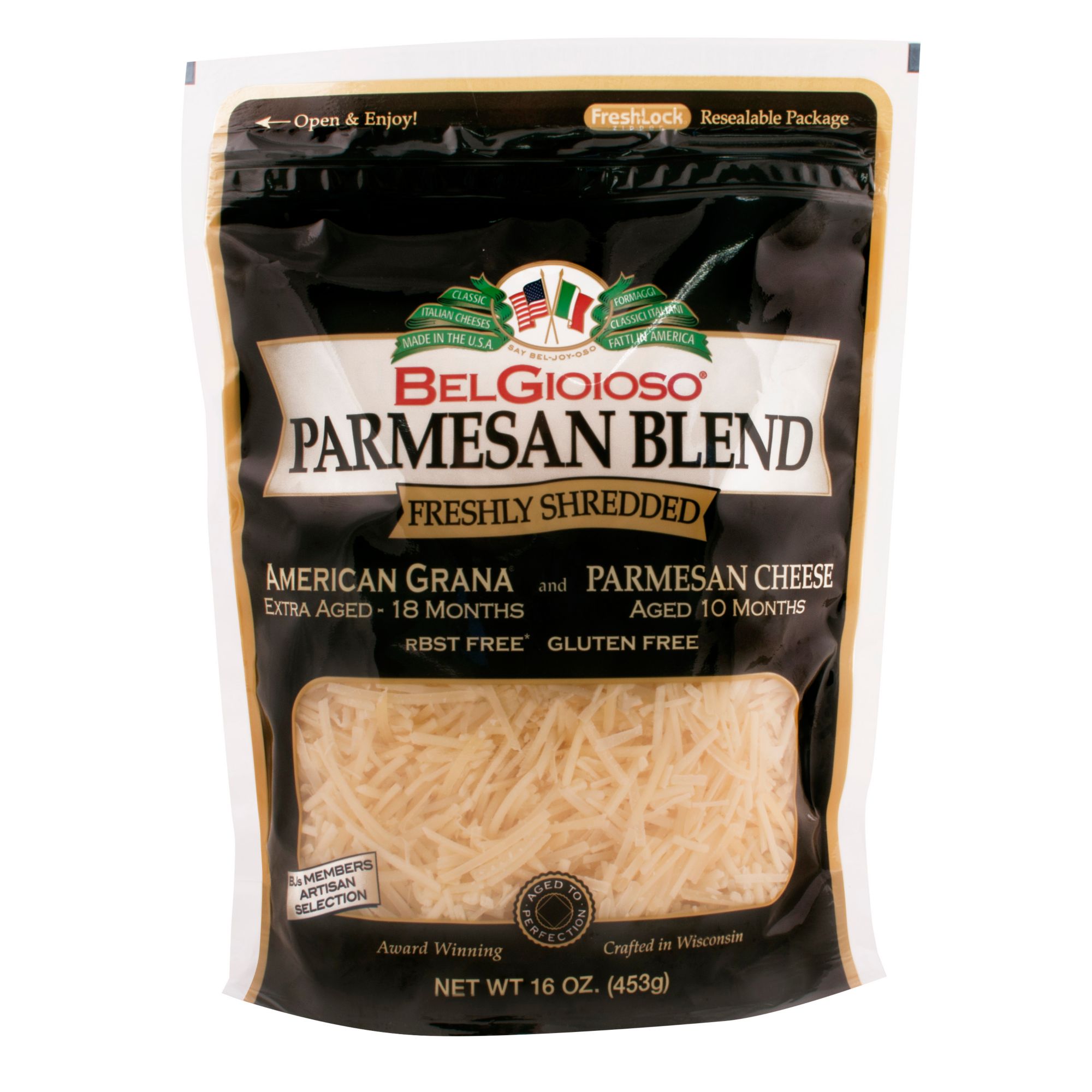 Made in USABelGioioso freshly shredded parmesan blend is a combination between 18 month aged grana and 10 month aged parmesan cheese. All BelGioioso cheese is made from fresh local milk from the great state of Wisconsin. This award winning cheese is made gluten free with no antibiotics. Product Features: Parmesan blend is a combination of American grana and parmesan cheeseThe American grana is extra aged for 18 months and the parmesan is aged for 10 monthsGluten freeIncludes 16 oz. BelGioioso parmesan blend
