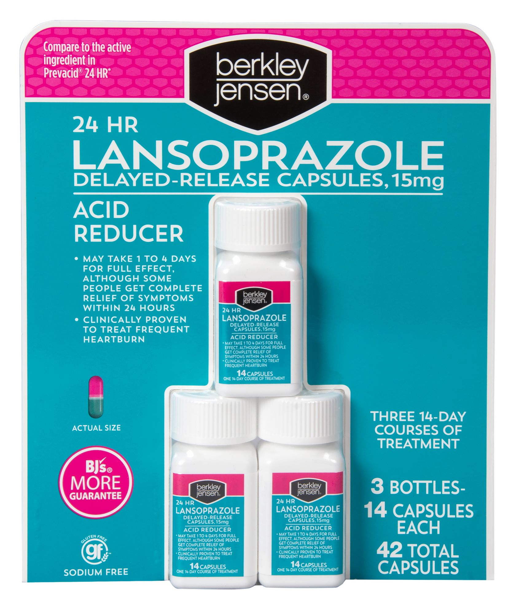 Berkley Jensen 24 Hour Lansoprazole is an acid reducer. It has clinically been proven to treat frequant heartburn. This pack includes 3 bottles of Lansoprazole containing 14 capsules in each bottle. Product Features: May take 1-4 days for full effect Some may experience complete relief of symptoms within 24 hours Clinically proven to treat frequent heartburn Includes 3 bottles of 14 capsules each, 42 total (Model 3T3AC)