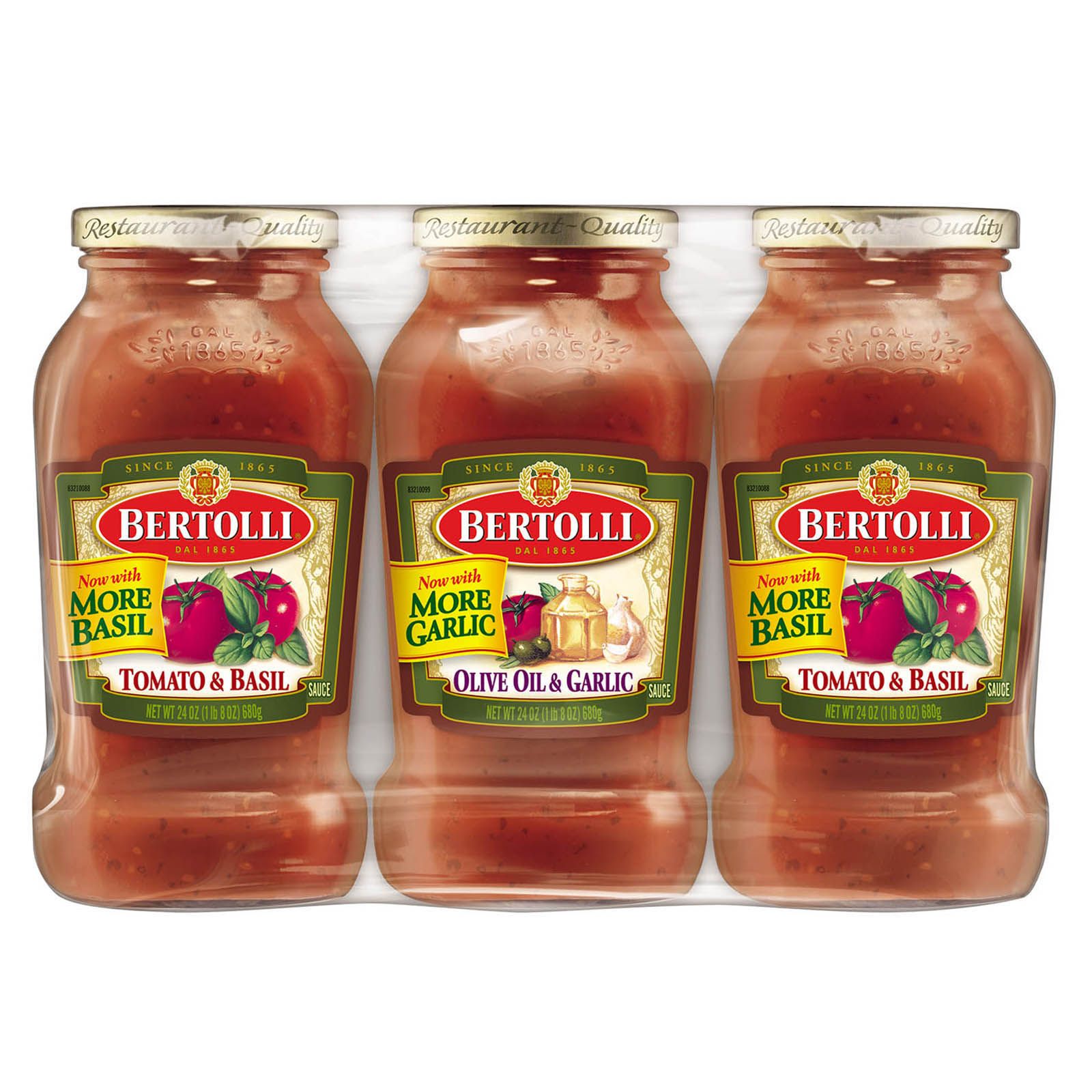 Bertolli variety pack pasta sauce gives you three distinct flavors that make your recipes and dishes even tastier. Make Italian creations with the timeless combination of vine-ripened tomatoes, summer-leaf basil and Bertolli extra virgin olive oil. Product Features: Bertolli gives you a variety pack of pasta sauceThree distinct flavors that make your recipes and dishes even tastierMake Italian creations with the timeless combination of vine-ripened tomatoes, summer-leaf basil and Bertolli extra virgin olive oilIncludes three jars of Bertolli variety pack pasta sauce, 24 oz. each (Model 036200144299)