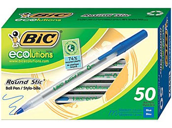 BIC Round Stic pens made from 74% recycled plasticrrMedium point, 1.0 mmrBlue inkrMade from 74% recycled plasticrFlexible round barrel for writing comfortrTranslucent barrel for visible ink supplyr50 pens per pack