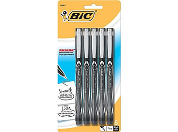 Make a statement with vividly smooth writing!rrFine pointrBlack InkrSmooth ink that WON’T BLEED through paperrProfessional, contemporary design with metal cliprWrites like a ball pen, vivid like a markerr5 per pack