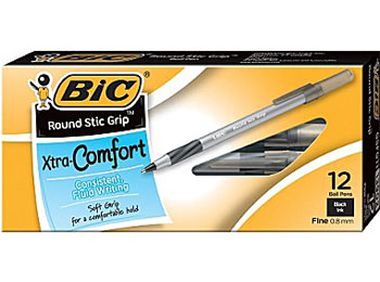 BIC Round Stic Grip Ballpoint Pens- Comfortable, Clear WritingrrFine point, 0.8 mmrBlackrSmooth-flowing ink provides neat, accurate linesrGrooved finger grip for comfortable, controlled writingrLightweight and comfortablerDesigned for long-lasting dependabilityr12 per packrrKeep a supply of BIC Round Stic grip ballpoint pens in your office for general office writing tasks. You and everyone in your office will enjoy the added comfort that these pens offer thanks to their special grips, and you’ll notice how the smoothly flowing ink makes it easier for you to write neatly.rrConvenientrThese BIC Round Stic grip ballpoint pens are disposable, so you won’t need to spend time and money refilling your pens. When the ink runs out, just grab a new pen and begin writing again instantly.rrComfortable rEach BIC Round Stic grip ballpoint pen is equipped with a grip at the bottom of its barrel. This makes it more comfortable to write with and gives you better control and coordination. The pens are lightweight for additional comfort.