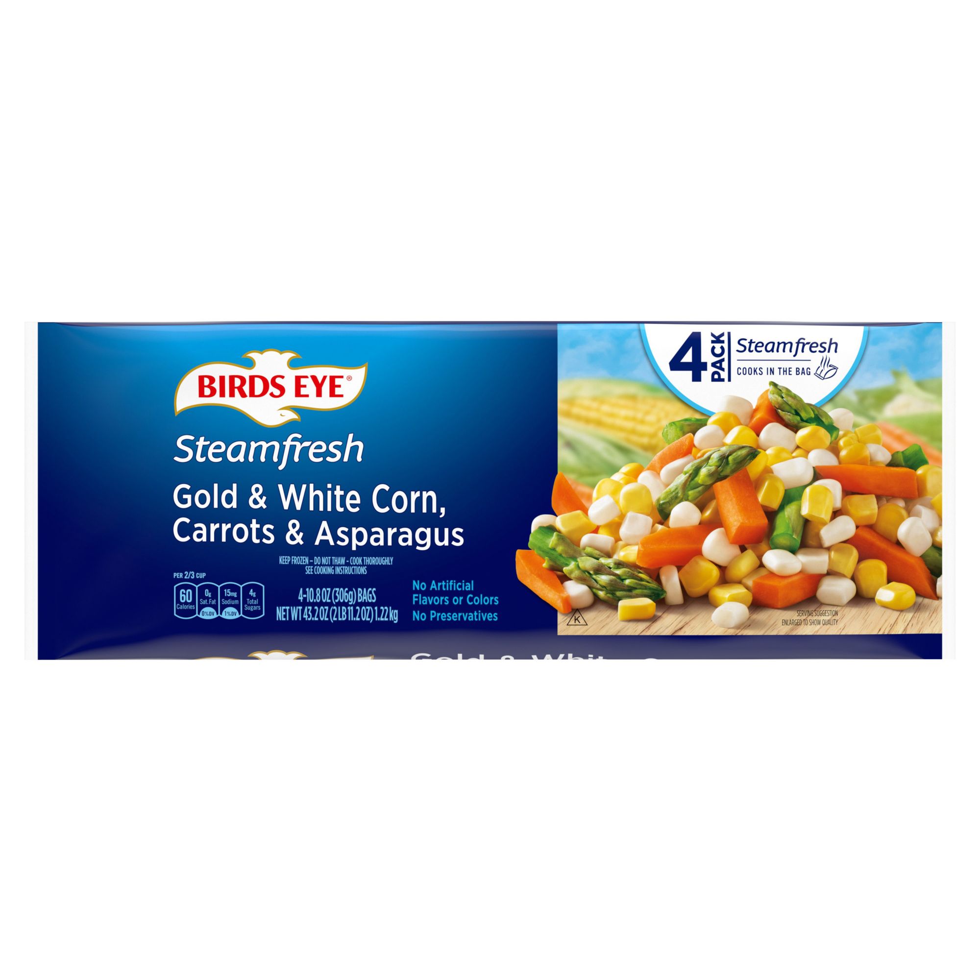 Made in USABirds Eye Steamfresh Mixed Vegetables include a delicious blend of gold and white corn, carrots and asparagus. Serve as a healthy dinner side dish or add to you favorite soup and casserole recipes. Product Features: Contains no preservatives just vegetablesNo artificial ingredients, flavors or colorsKosher certifiedPerfectly cooks in the bag and ready in minutesProduct of USAIncludes four pack of 10-oz. mixed corn, carrots and asparagus Product Warnings and Restrictions: (Model 014500017512)