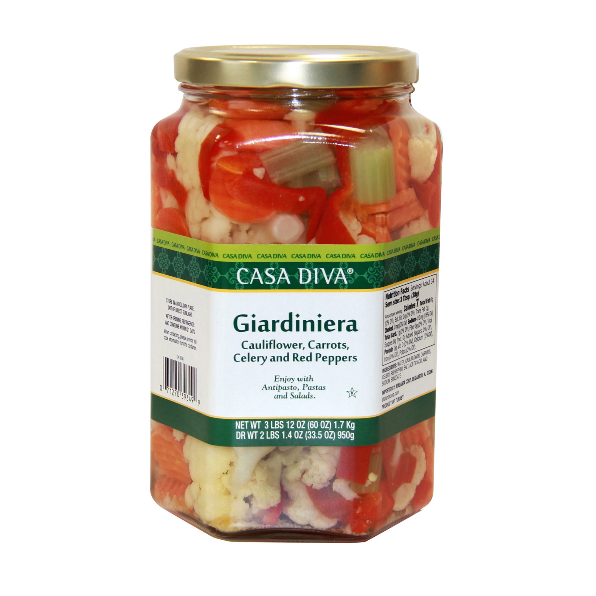 Add a burst of color to any dish with the convenience of this tasty giardiniera. Packed full of wholesome flavor and authentic taste. This giardiniera features a combination of mild cauliflower, carrots, celery, and red pepper strips. Similar to “chow chow,” this Italian-style mix of vegetables is packed and preserved in vinegar to maintain freshness and flavor. Whichever way this flavorful blend is used, it’s sure to make a welcome addition to your sandwich shop, Italian restaurant, or pizza shop. Giardiniera is commonly served with antipasto, salads, and pasta dishes. This healthy vegetable mixture is also great for tossing in pasta salads and sprinkling on vegetable pizzas. Product Features: Great in salad mix Perfect pizza topping Ideal sandwich topping especially for Chicago style Italian beef sandwiches Ingredients:Water, Cauliflower, carrots, celery, red pepper, salt, acetic acid, sodium benzoate.