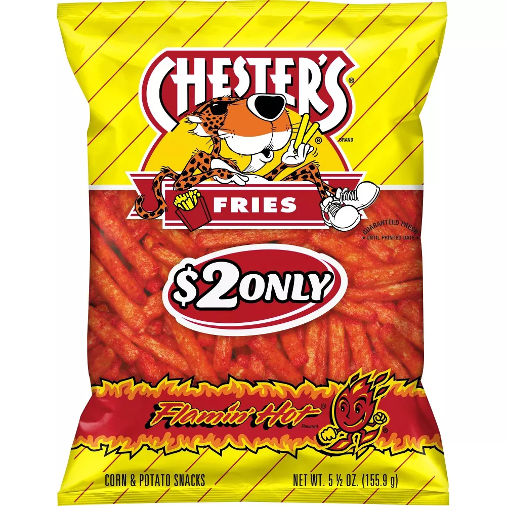 CHESTER’S FLAMIN’ HOT Fries Flavored Corn & Potato Snacks. When CHESTER CHEETAH puts his name on a snack, you can count on a bold and cheesy flavor like you’ve never tasted. Watch out! There’s a fire in this bag. Dive into a read hot blaze of fiery crunch with Chester’s brand Flamin’ Hot Corn & Potato Snacks
