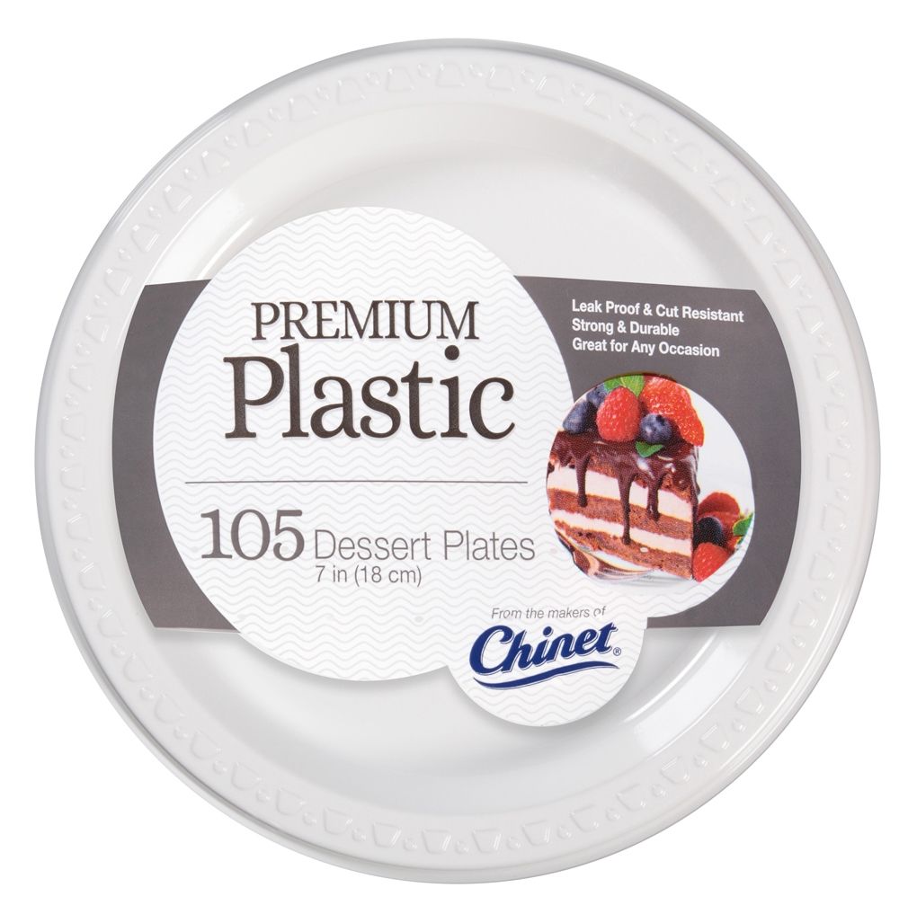 Don’t worry about a big cleanup when you use Chinet 7″ Plastic Plates. The plastic plates are perfectly sized for holding desserts and appetizers and are constructed to be leak-proof and cut-resistant, helping to prevent messes from forming on other surfaces or clothes. Just toss the plates out when finished – no washing required. Product Features: Plastic platesLeak-proofCut-resistantIncludes 105 plates (Model 38380)