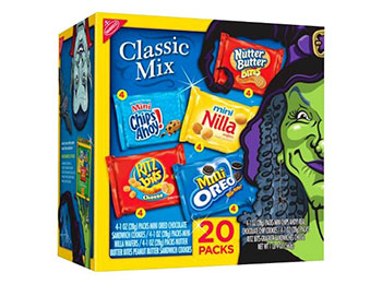 Enjoy a small snack with this combination of Nabisco Classic Cookies & Crackers. This pack includes four 1-oz packages each of mini Oreo Chocolate Sandwich Cookies, Nilla Wafers, Nutter Butter Peanut Butter Sandwich Cookies, Chips Ahoy Chocolate Chip Cookies and Ritz Bits Cracker Sandwiches with Cheese. Available in a 20-count box, these Nabisco treats are an excellent traveling snack or lunch-box solution.