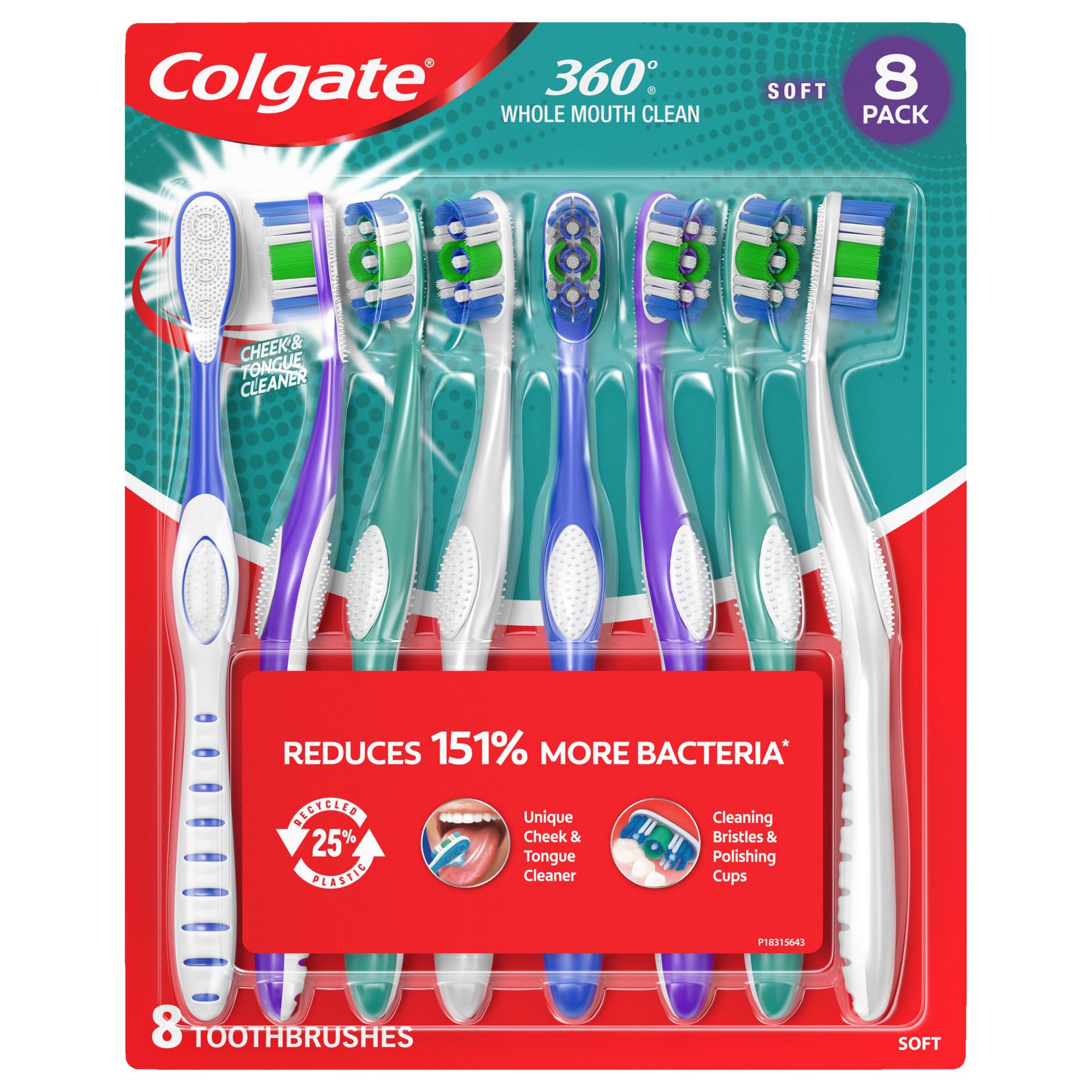 The Colgate Total Whitening Manual Toothbrush is designed with tapered bristles that are 17 times thinner than ordinary end-rounded bristles. The purple-ended tapered bristles gently reach deep between teeth and along the gum line for a deeper reach, compared to an ordinary flat-trim toothbrush. This toothbrush also features spiral polishing bristles that help remove surface stains from teeth for a naturally whiter smile. Product Features: Tightly packed bristles help to remove more plaque vs. an ordinary toothbrushUnique Colgate 360 cheek and tongue cleaner help comfortably remove odor-causing bacteriaSoft dentist-like polishing cups help delicately remove stainsRemoves over 96% more bacteria vs. a flat trim toothbrushDentists and hygienists recommend replacing your toothbrush every three monthsIncludes 8 pk. Colgate total whitening manual 360 toothbrushes, soft/medium (Model CN08092A)
