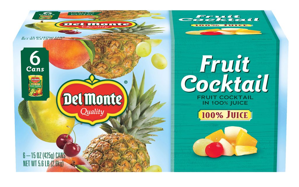 Del Monte Fruit Cocktail is a tasty mix of preservative- and fat-free peaches, pears, grapes, pineapple and cherries, packed fresh in 100% real fruit juice from concentrate. Product Features: Tasty mix of peaches, pears, grapes, pineapple and cherriesPacked fresh in 100% real fruit juice from concentratePreservative and fat freeIncludes six 15-oz. cans (Model 52434)