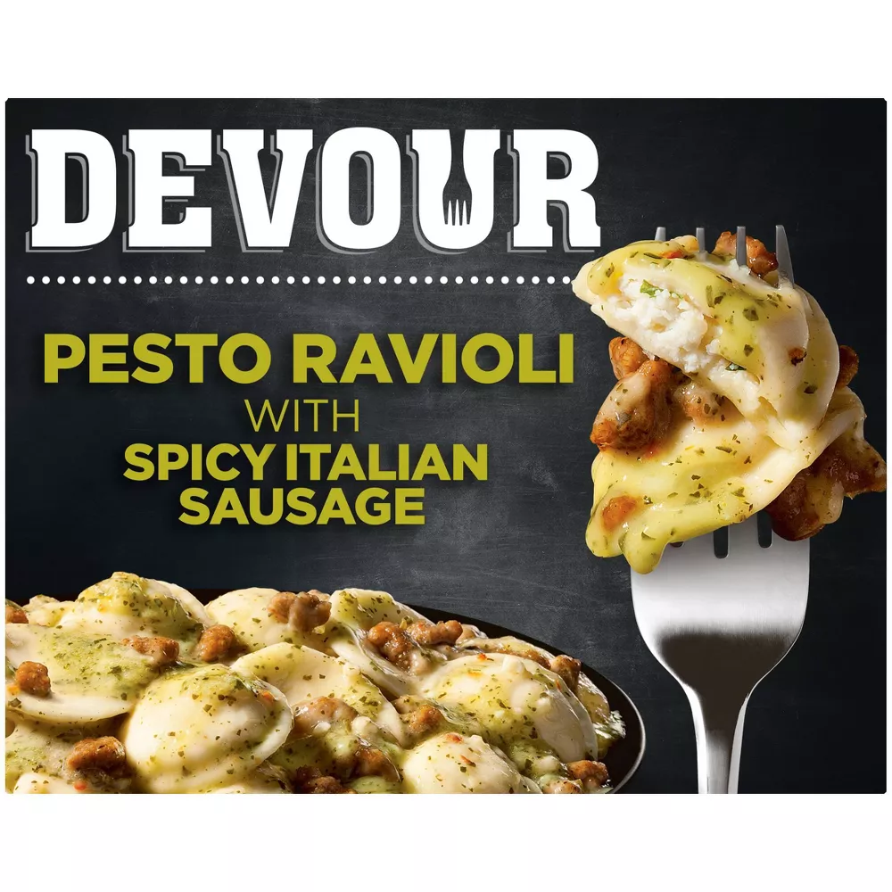 DEVOUR Pesto Ravioli with Spicy Sausage frozen dinners dial up the taste, max out the flavor and turn up the texture. Our hearty frozen pasta meals are sure to satisfy big appetites. Plump cheese ravioli is tossed with creamy pesto sauce and spicy sausage for an authentic Italian taste. Ready to eat in minutes, our frozen meals come in 12 ounce microwaveable serving trays for fast and convenient feasting. DEVOUR frozen food makes it easy to enjoy a quick, hot meal at home or in the break room, so be sure to keep your freezer stocked with deliciousness.