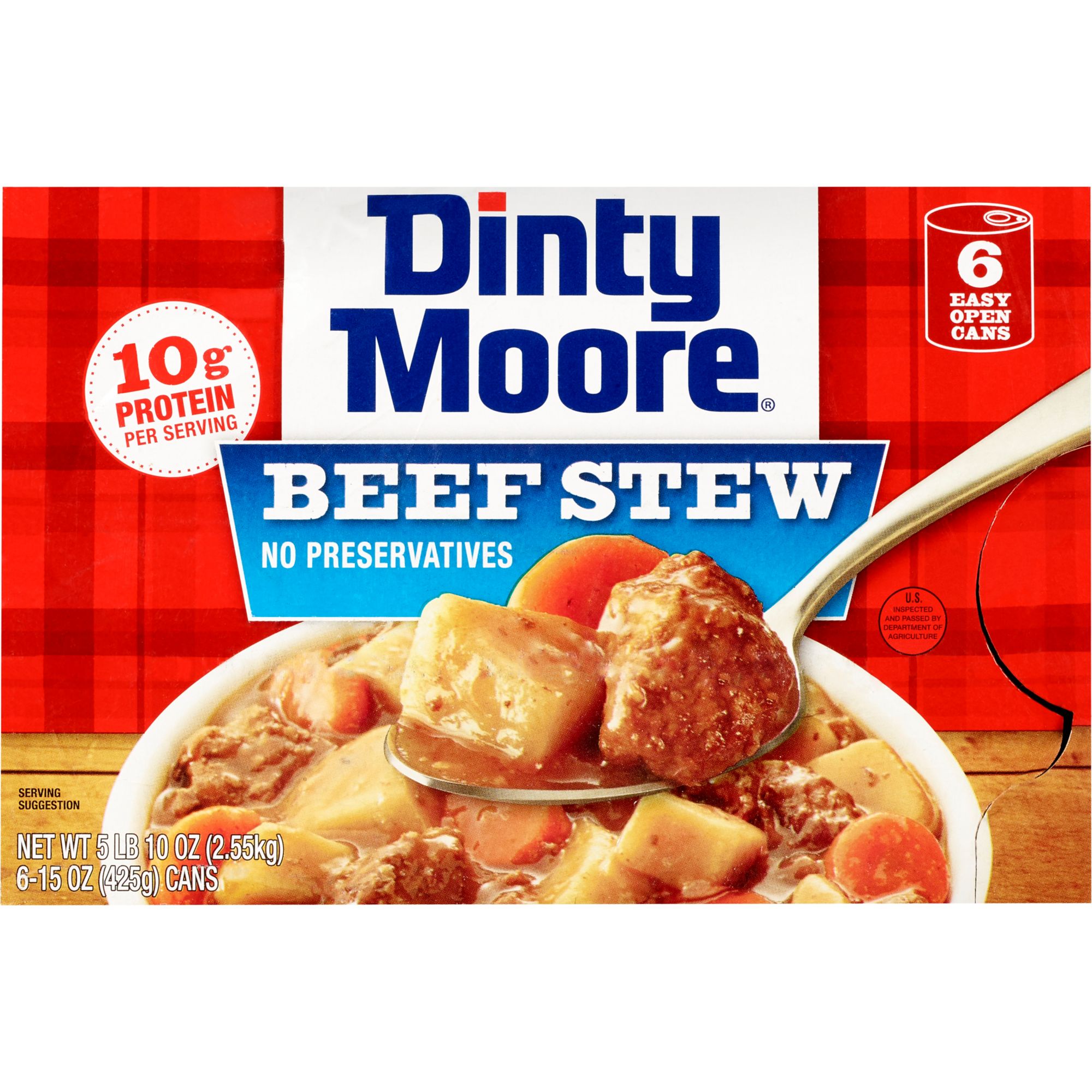 Made in USAEnjoy great tasting beef, fresh cut potatoes, carrots, and rich gravy in the beef stew that works as hard as you do. Each serving has 10 grams of protein and is gluten free. Simply heat and eat for a meal that works as hard as you do. Product Features: Six 15oz cans10 grams of protein per serving Gluten freeNo preservatives addedEvery can is loaded with hearty chunks of meat and vegetablesSimply heat and eat for a meal that works as hard as you do Ingredients:: Beef Stock, Beef, Potatoes, Carrots, Contains 2% or less of Beef Fat, Corn Flour, Textured Vegetable Protein (Soy Flour, Caramel Color), Salt, Tomato Paste, Modified Cornstarch, Potato Starch, Mushroom Extract (Mushrooms, Maltodextrin), Caramel Color, Disodium Inosinate and Disodium Guanylate, Sugar, Flavoring.