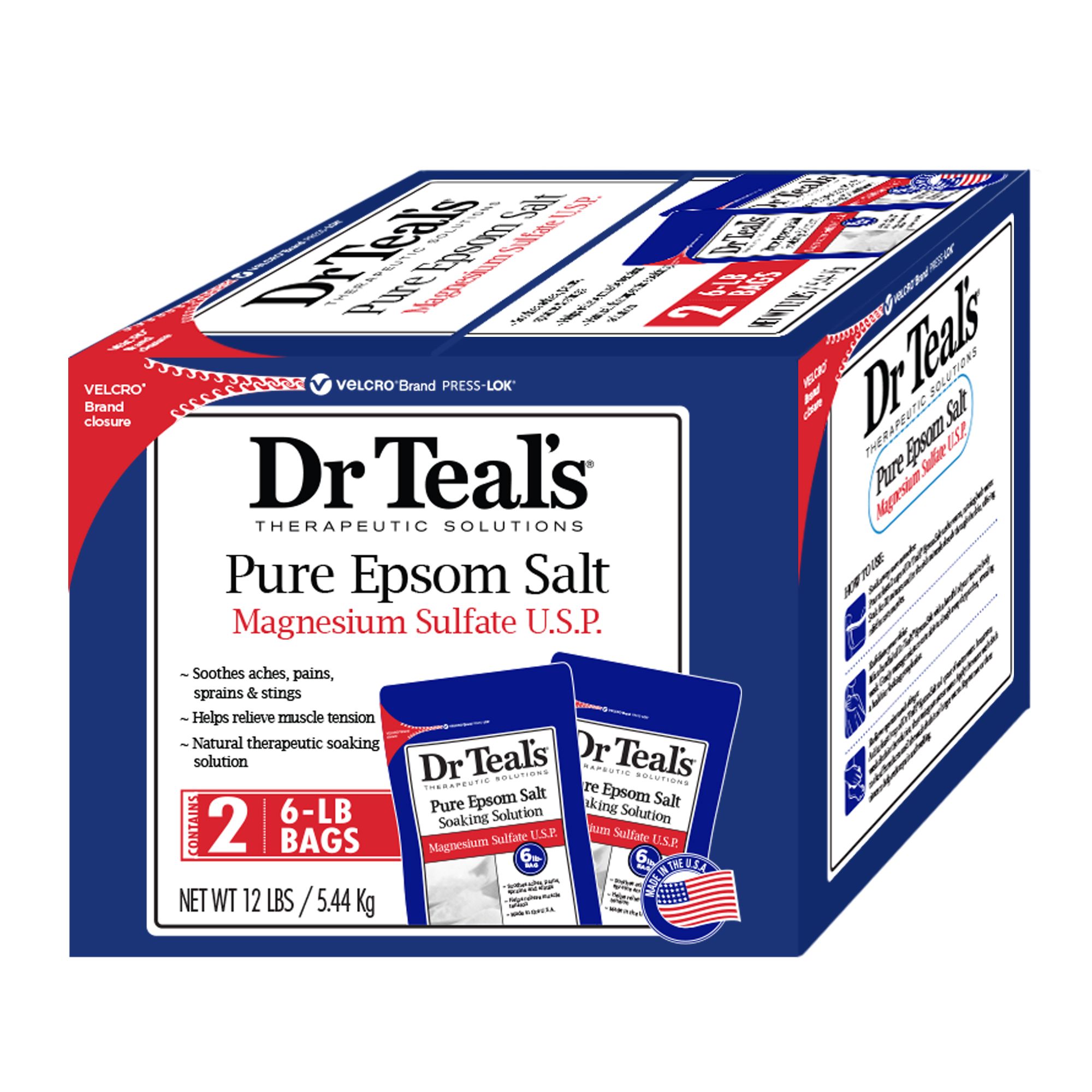 Dr. Teal’s Pure Epsom Salt relieves aches and pains and soothes sore muscles and tired feet. Product Features: Natural, pharmacy grade Magnesium Sulfate U.S.P.Relieves aches and painsSoothes sore muscles and tired feetFast dissolving, ultra-fine crystalsMade in USAIncludes two 6 lb. bags (Model 04035-1PLT)