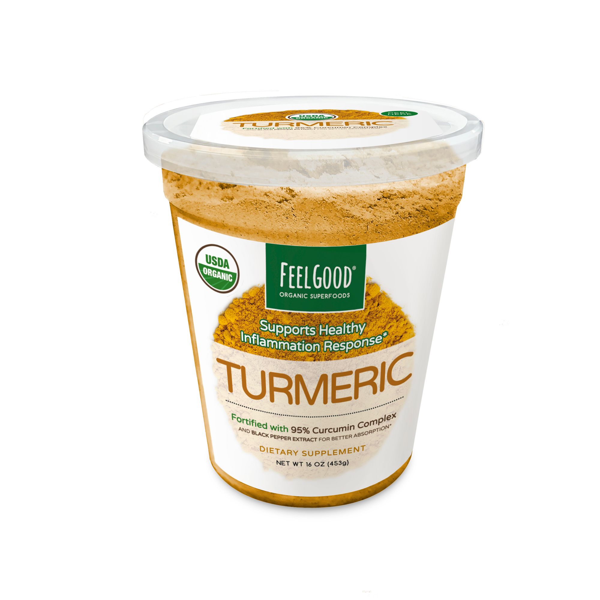 Turmeric is rich in curcumin, which has been proven to act as a very strong antioxidant and anti-inflammatory that also supports digestive, cardiovascular, joint and immune system health. A well-known spice in many cultures, turmeric is famous for its flavor and the presence of curcuminoids. certified organic turmeric root powder is non-synthetic and of the purest quality. FEEL GOOD Fortified Turmeric is fortified with organic 95% curcuminoids extract and organic black pepper extract for the maximum benefits of curcumin and optimal absorption. Health benefits such as powerful antioxidant properties, supports healthy inflammation response, and supports healthy immune system function. Feel Good sources products from their indigenous regions to maintain sustainability and ensure that potency, quality and purity are uncompromised. Product Features: OrganicAll naturalNon-GMO