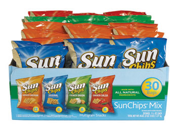 Frito Lay Sunchips are made with whole grains Variety pack includes: 12 Harvest Cheddar, 6 Original, 6 French Onion, and 6 Garden Salsa 30 bags per box. 1.5 oz. bags For vending, fits into coil sizes 1, 2, 3 and 4