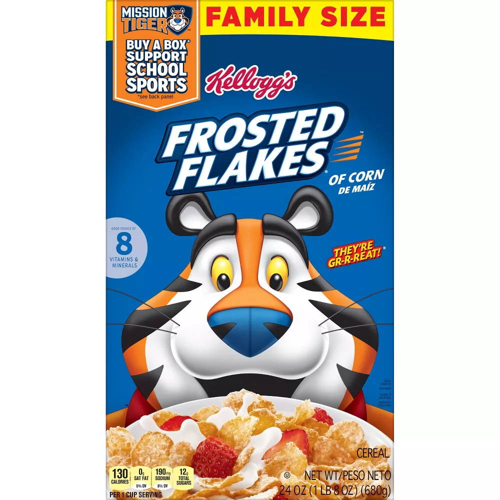 Just like Tony the Tiger, your whole family can get even their busiest days going with Kellogg’s Frosted Flakes ready-to-eat breakfast cereal. Thanks to the toasty, crunchy corn flakes sprinkled with sweet frosting, adults and kids experience a tasty and satisfying bowl every time. Each serving of this cereal is fat free and a good source of 8 vitamins and minerals. Plus, there are no artificial colors or flavors; enjoy a bowl of Kellogg’s Frosted Flakes with your favorite dairy or nut milk. Eat pawfuls as a snack or late-night bite. Make it a sweet complement to your morning coffee or tea. Crush them up as a crunchy topping for ice cream. Kellogg’s Frosted Flakes cereal gives you the sweet spark to go all in and let your GR-R-REAT out.