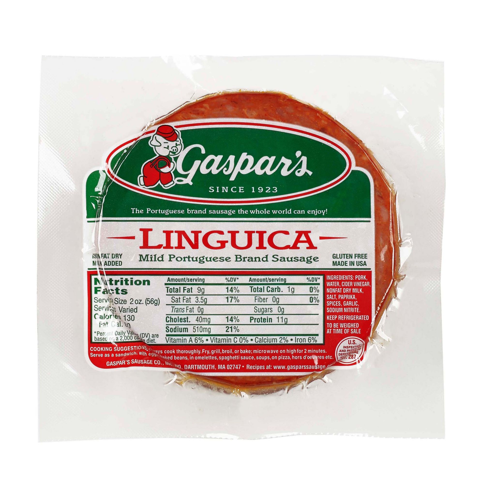 Made in USAGaspar’s Linguica is a mild pork sausage still manufactured according to an old Portuguese recipe. It is a fine blend of lean pork with a mixture of such basic spices as vinegar, salt, paprika and garlic. After being stuffed into a natural casing, the Linguica is then smoked until the special flavor and federally required temperatures are reached. Sausage lovers will find Linguica to be very versatile, adding a special touch to many recipes. Product Features: Portuguese sausage Gluten free Family owned and operated since 1923 USDA Inspected Ingredients: Pork, Water, Vinegar, Nonfat Dry Milk, Salt, Paprika, Spices, Garlic, Sodium Nitrite Product Warnings and Restrictions: Non-fat dry milk added