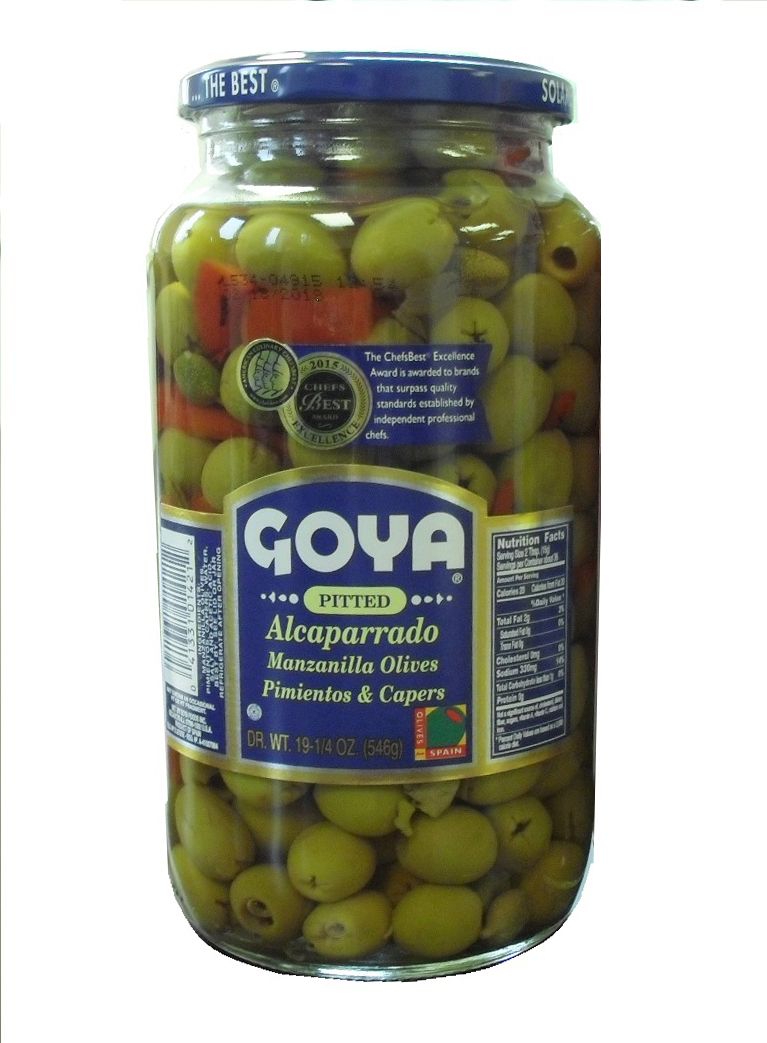 Ideal for use in a variety of recipes, such as rice and green pigeon peas or beef stews, this Goya 20 Oz. Alcaparrado Pitted Olives, Pimientos and Capers jar delivers a unique flavor. The jar contains manzanilla olives, capers and strips of pimientos. Product Features: Made with manzanilla olives, capers and strips of pimientosIdeal for adding to rice and green pigeon peas or beef stew dishesKosherProduct of SpainIncludes 20 oz. of pitted olives, pimientos and capers in a glass jar Product Warnings and Restrictions: May contain an occasional pit or pit fragment. (Model 6789)