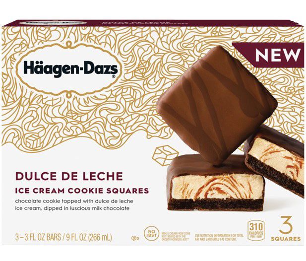 Made in USAHaagen-Dazs Dulce de Leche Cookie Squares are made with a rich dark chocolate cookie topped with dulce de leche ice cream and swirls of luscious caramel coated in a milk chocolate shell with a drizzle of dark chocolate. It’s sweet, decadent and the perfect cool treat for any chocolate lover. This box includes 10 cookie square ice cream bars. Product Features: Dulce de Leche cookie squares Dark chocolate cookie topped with Dulce de Leche ice cream and swirls of caramel and a milk chocolate shell drizzled in dark chocolateMade with five simple ingredientsIncludes 10-count of 3-fl.-oz. cookie square ice cream bars Product Warnings and Restrictions: Contains dairy