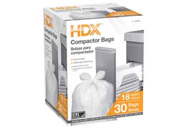 HDX Compactor bags are made from a blend of high-performance polyethylene resin for strength and performance. Sized to fit most standard trash compactors and thick enough to support the pressure of a compactor. rWith 30 bags in each box, it is a great value for any home. rEasy tie flaps. White. r18 Gallons capacity. rOne-by-one dispensing.