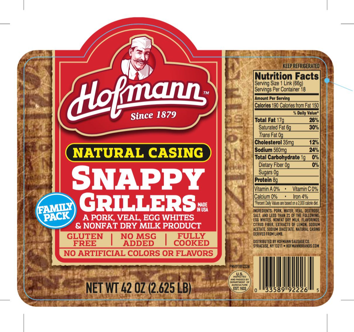 Made in USAEnjoy the natural casing of these Hofmann Snappy Grillers. They’re made with pork and veal and are fully cooked, so you can just heat them up and enjoy. Product Features: Pork and veal snappy grillers with a natural casingFully cookedGluten freeNo MSGNo fillersNo artificial flavors or colorsIncludes 18 snappy grillers Product Warnings and Restrictions: Contains eggs and milk. (Model 033589-922265)
