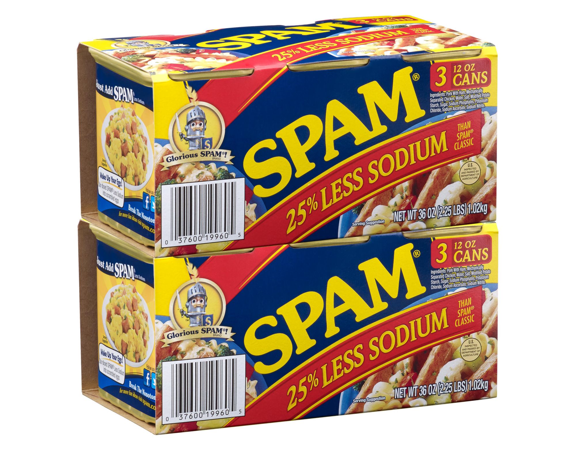 Having to cut back on sodium can take a lot of tasty things out of the equation. Fortunately, Spam Less Sodium is not one of those things. It provides the same delicious Spam Classic flavor with 25% less sodium. There’s no sacrifice with this meat treat. Product Features: Great sliced, diced, baked or fried The taste that started it all back in 1937 More than 75 years in the marketplace Spam is the tasty, high-quality kitchen staple known and loved world wide Fully-cooked, and made of 100% percent pure pork and ham Distinct savory and salty-sweet taste Includes six 12-oz. cans (Model 19960) Product Warnings and Restrictions: Made in a bakery that may contain milk and tree nuts.