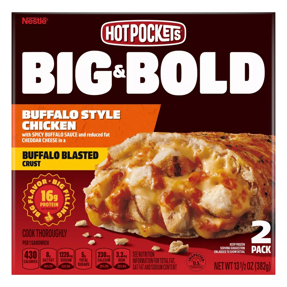 Go big or go home with Hot Pockets Big & Bold Buffalo Style Chicken Frozen Sandwiches. Big & Bold Hot Pockets sandwiches are 50% larger than the standard Hot Pockets sandwiches, making them a great choice for a quick lunch, easy dinner or on the go snack. Each microwaveable chicken sandwich is loaded with white meat chicken, spicy Buffalo sauce and reduced fat cheddar cheese, all inside a crispy Buffalo-blasted crust. Those with adventurous palates are sure to love this frozen lunch snack for its tasty combo of bold flavors. Not only do these Buffalo chicken sandwiches satisfy the taste buds, they are also packed with 16 grams of protein per serving. You don’t have to sacrifice time for a hearty meal with this microwavable comfort food. Heat one Big & Bold Hot Pocket in the microwave for a high protein snack that is full of flavor. If you have more time, try a Hot Pockets frozen sandwich in a conventional oven. Keep Hot Pockets microwave sandwich snacks in your freezer until you are ready to enjoy their deliciously bold flavors. Take your tastebuds on more adventures by trying other Hot Pockets Big & Bold varieties, including Chicken Bacon Ranch and Double Pepperoni Pizza.