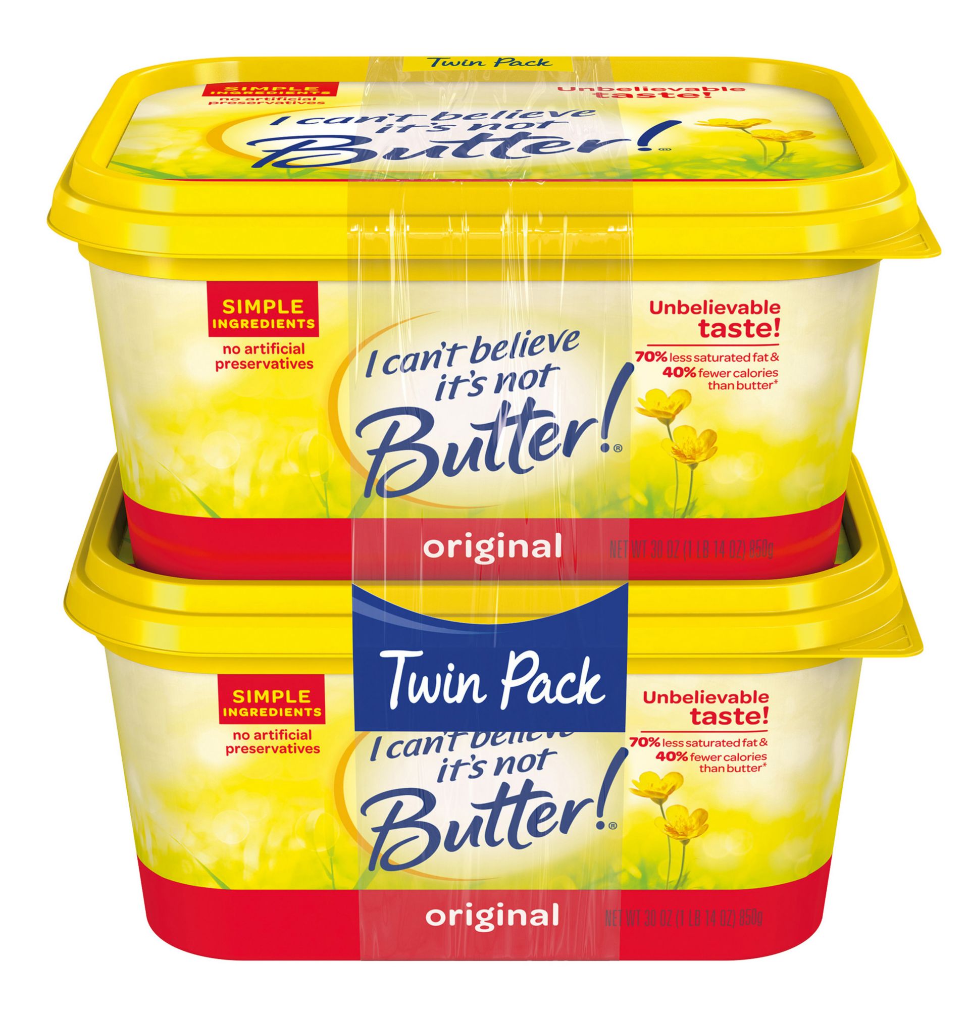 With I Can’t Believe It’s Not Butter! 30 Oz. Spreads, you can add a little zing to your meals. This spread features 70% less saturated fat and 30% fewer calories than butter while still offering that fresh butter taste your family loves. Product Features: For use in cooking and other culinary applicationsFresh butter taste with 70% less saturated fat and 30% fewer calories than butterIncludes two 30 oz. tubs of spread (Model 040600043328)