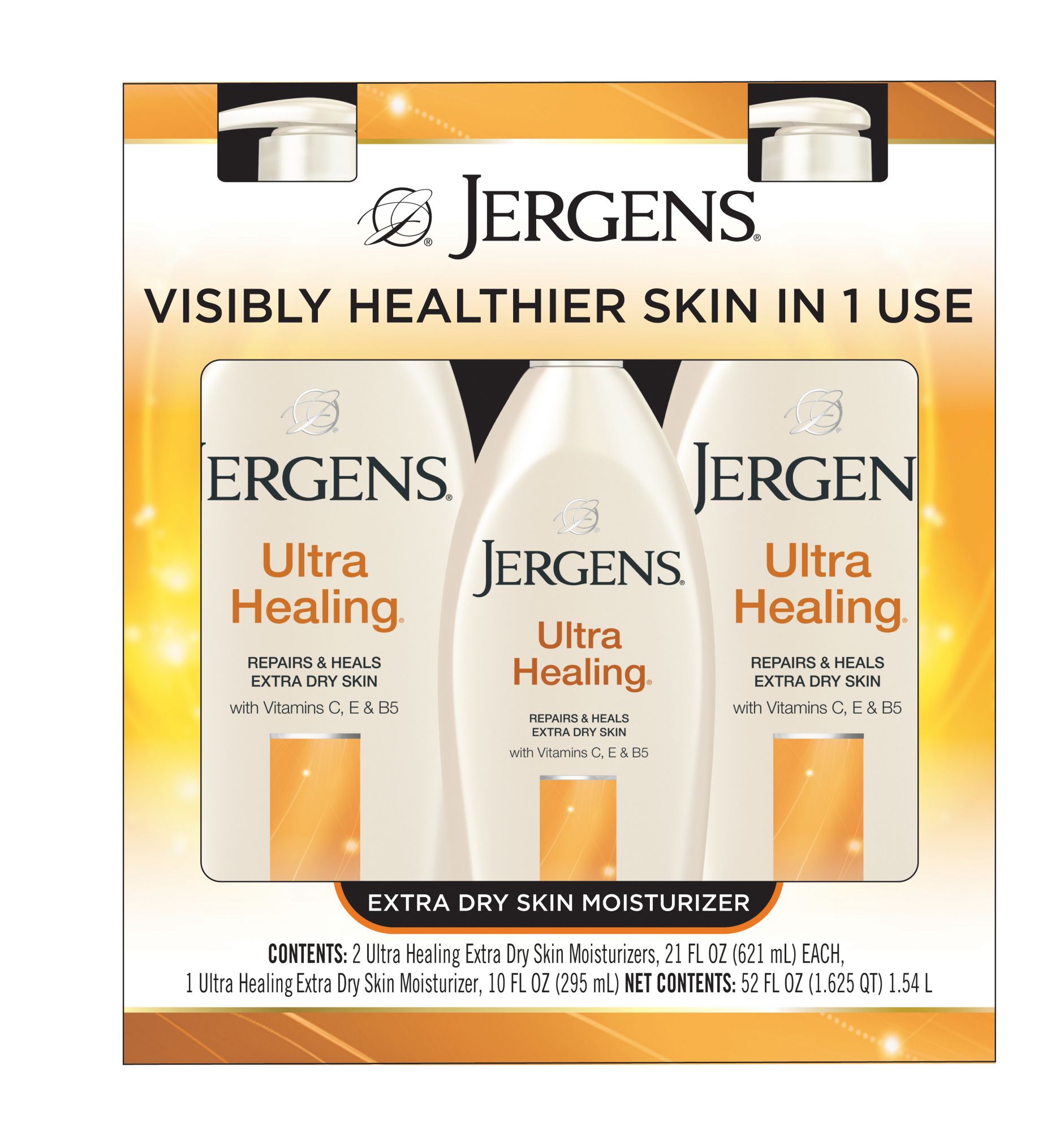 Jergens Ultra Healing Lotion heals dryness at the source for visibly healthier skin. Made with a blend of vitamins C, E and B5, this fast-absorbing body lotion goes deep beneath the skin’s surface to lock in moisture for up to 48 hours.  Product Features: Repairs, heals and deeply nourishes extra dry skin, Reveals visibly luminous, healthier skin, Contains a unique illuminating HydraLucence blend and Vitamins C, E, and B5, Heals dryness at the source by penetrating through 5 layers of the skin’s surface, Absorbs quickly and locks in moisture for up to 48 hours, Includes two 21-oz. bottles and one 10-oz. bottle  (Model 18034)