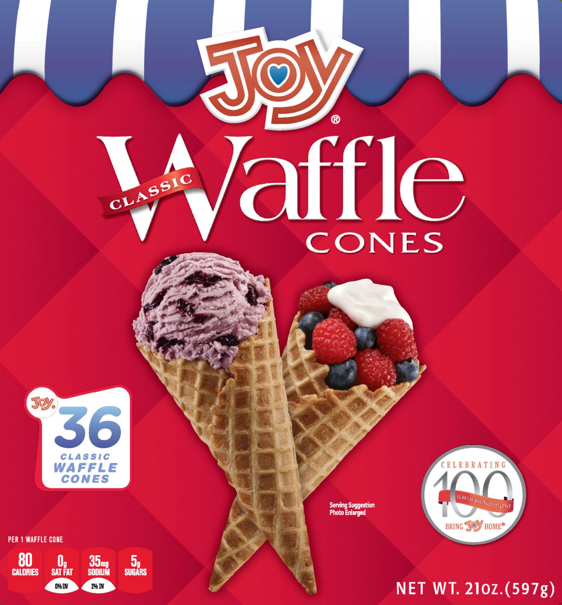 The Joy waffle cone is a classic favorite for all ice cream lovers, the crisp waffle cone is always a great way to enjoy ice cream. Our adaptation of the original cone, first made and sold at the 1904 St. Louis World’s Fair, makes for a large, crispy cone for ice cream lovers. Product Features: Each cone has 80 calories, 0g of SAT fats and 5g of sugarGoes great with ice cream or frozen yogurtIncludes a box of 36 classic Joy waffle cones