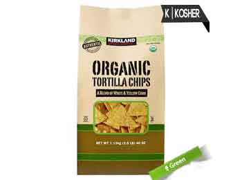 Kirkland Signature tortilla chipsrPackage size 40 ozrMade with a blend of white and yellow corn rUSDA OrganicrGluten-freerKosher