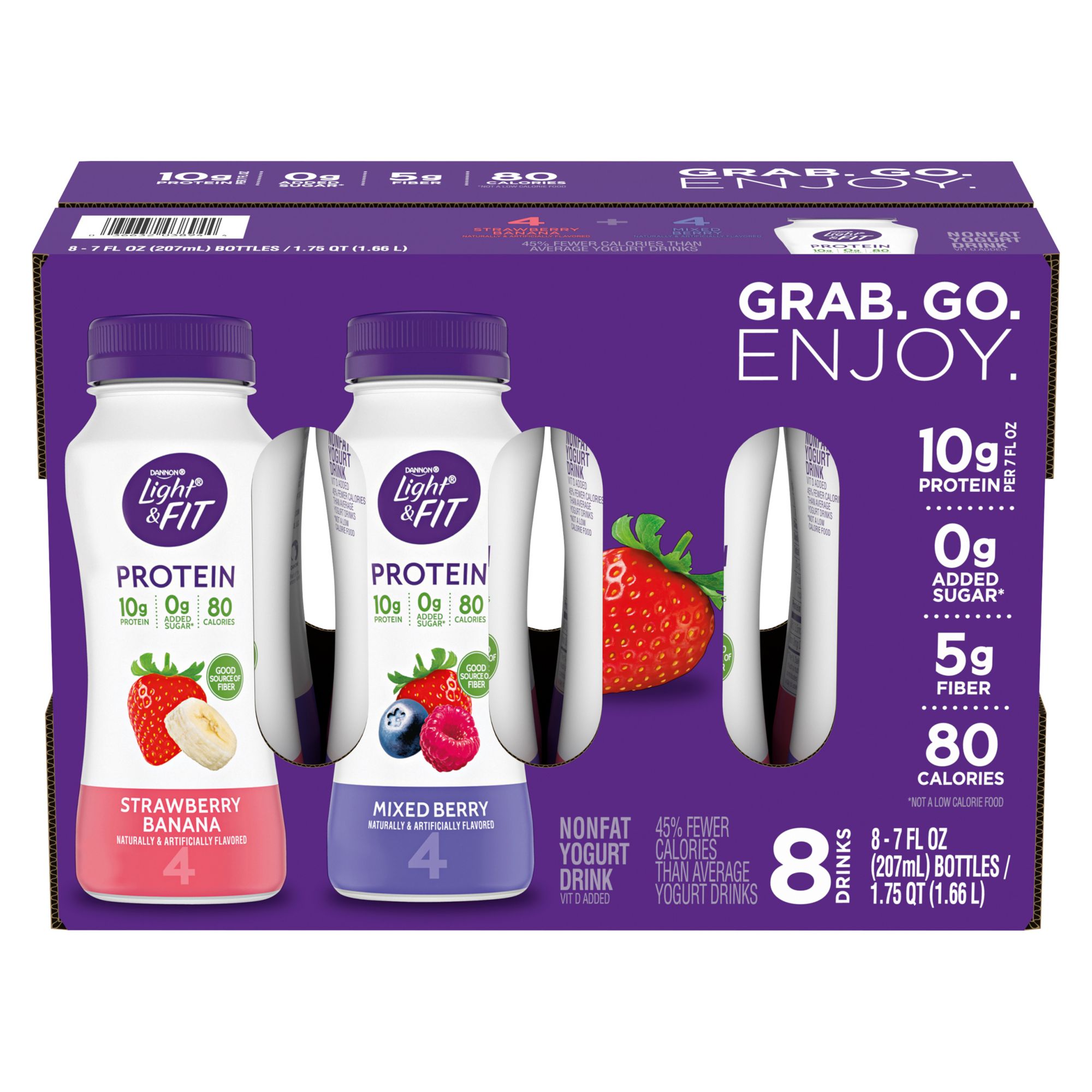 Made in USAThis pack includes two delicious flavors, Mixed Berry and Strawberry Banana. It is a great yogurt option for an on-the-go snack. In terms of nutritionals, it has less sugar, less calories, and more protein than the leading competitor (0g sugar added, 10g of protein, 80 calories per bottle.) It is certified gluten-free and a great low-calories option. For balanced nutrition on-the-go, Dannon Light & Fit Protein Smoothies are a smart choice. Shake up your routine with your favorite fruit flavors in a smooth 7 fl. oz. protein smoothies with 10 grams of protein, 80 calories, 0 added sugar, and 0% fat. A delicious way to eat well on-the-go. Product Features: Club packOn-the-go0g Added Sugar10g proteinLow calorie (80 cal/bottle)Gluten-free Ingredients: Mixed Berry Cultured Non Fat Milk, Water, Milk Protein Concentrate, Less Than 1%:, Modified Food Starch, Natural And Artificial Flavors, Fruit And Vegetable Juice (For Color), Lemon Juice Concentrate, Lactase*, Sucralose, Acesulfame Potassium, Vitamin D3, Active Yogurt Cultures L. Bulgaricus & S. Thermophilus StrawBanana Cultured Non Fat Milk, Water, Milk Protein Concentrate, Less Than 1%:, Modified Food Starch, Natural And Artificial Flavors, Annatto Extract (For Color), Lemon Juice Concentrate, Lactase*, Sucralose, Acesulfame Potassium, Vitamin D3, Active Yogurt Cultures L. Bulgaricus & S. Thermophilus