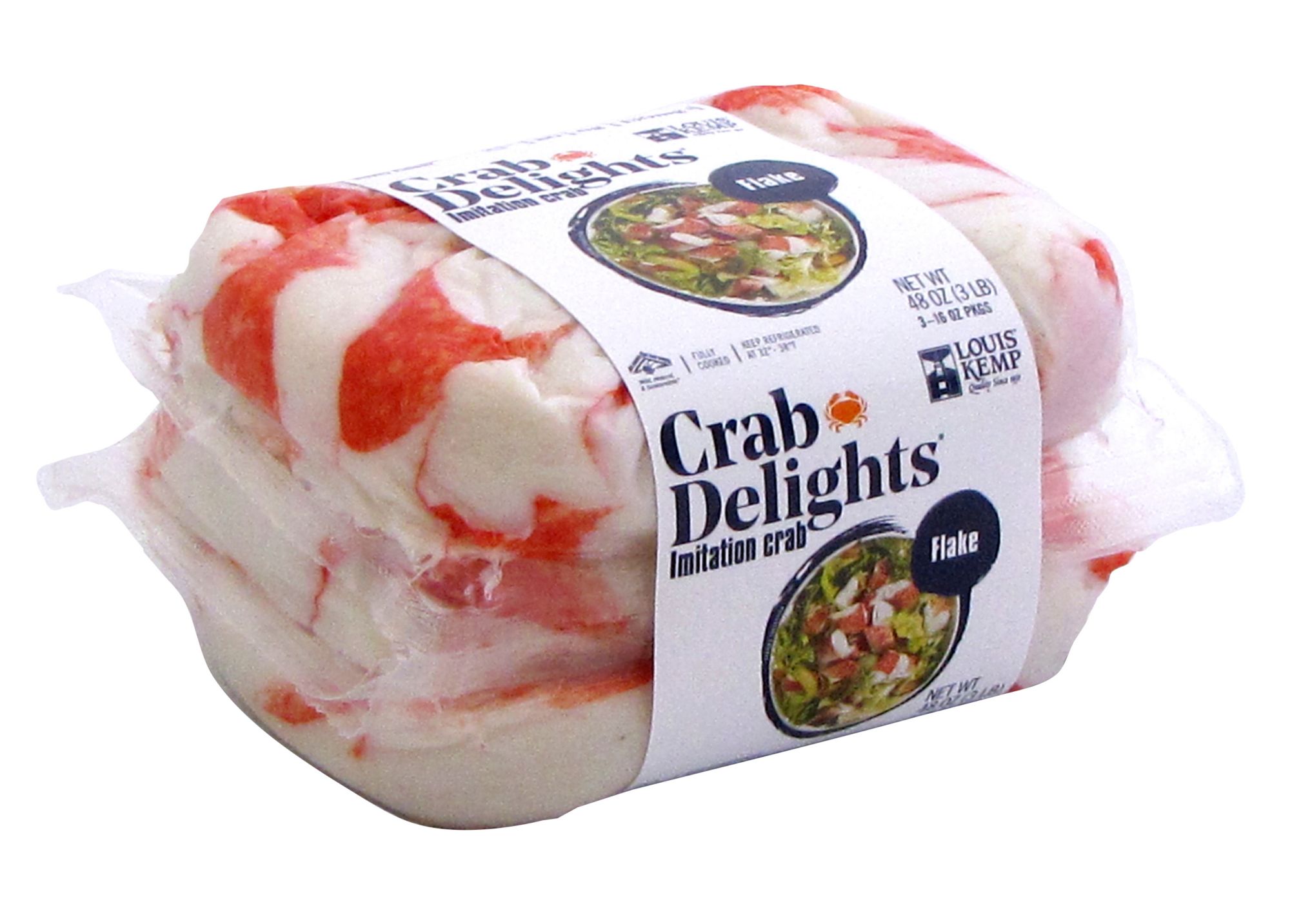 Made in USAMade from wild Alaska pollock and real crab, Louis Kemp Crab Delights have the delicate flavor of crab meat. These are fully cooked, ready to eat and easy to add to any dish. Turn your favorite pasta, salad or sandwich into a special seafood dish with these crab delights. Product Features: Refrigerated and ready to eatImitation crab made from wild Alaska pollockGluten freeLow calorieLow cholesterolGood source of proteinIncludes 3 lbs. of Louis Kemp crab delights Product Warnings and Restrictions: Contains fish (Alaska pollock), wheat, eggs, crustacean shellfish (snow crabmeat) and soy (Model 0000)