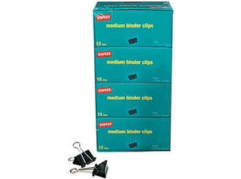 Staples Metal Binder Clips- Keep Papers and Files Together Superior holding power 12 boxes of 12 clips each Size: 1 1/4" with 5/8" capacity (Medium) Staples Brand 100% Satisfaction Guaranteed Keep stacks of paper together without using binders or folders by snapping one of these Staples metal binder clips onto each stack. You can also use these versatile clips to close file folders for easy carrying. The clips are easy to use and extremely secure. Ease of Use All you need to do is spread each of these Staples metal binder clips open with the provided handles, and then insert your papers before you let go of the clip. The clip’s secure jaws will close down over the papers and hold them together. Strong Holding Power These clips clamp down strongly and securely around your papers. They prevent individual pages from falling out or slipping out of a stack. Convenient and Versatile You can use these clips to secure file folders for carrying or clip a paper to an easel, a desktop, or another hard, flat, open-edged surface. These Staples metal binder clips are medium sized, and you can also order large metal binder clips from Staples.