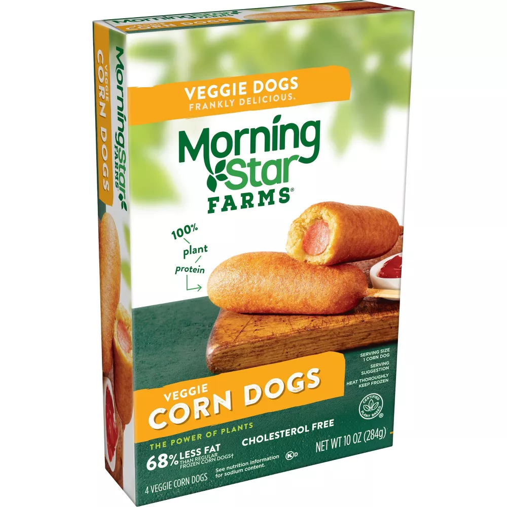A delicious vegan snack or part of a savory meal, MorningStar Farms Veggie Corn Dogs are plant-based and feature a delicious, hot-off-the-grill taste with a sweet and crisp coating. With 68% less fat than regular frozen corn dogs*, these meat alternative corn dogs are low in saturated fat (contains 2.5g total fat per serving) and are cholesterol free (contains 1g monounsaturated fat and 1.5g polyunsaturated fat per serving, see nutrition information for sodium content); Whether you’re seeking a quick lunch, a hearty dinner, or a fun food for game time, parties, or after school, MorningStar Farms Corn Dogs are sure to delight vegans and meat-lovers alike. *Regular frozen corn dogs contain 9g total fat per serving (78g). MorningStar Farms Veggie Corn Dogs contain 2.5g total fat per serving (71g).