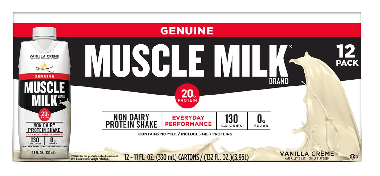Made in USAMuscle Milk Non-Dairy Protein Shakes include a blend of high-quality proteins that help fuel workout recovery, provide sustained energy and help build strength in a gluten-free formula. Drink a shake pre-workout, post-workout or as a protein-rich snack. Product Features: Contains 20g of protein and 4g of fiber per shake Sugar-, gluten- and lactose-free 130 calories Helps build lean muscle Good for recovery after exercise Excellent source of antioxidant vitamins A and C, vitamin D, calcium, magnesium and phosphorus for strong bones Certified kosher Includes twelve 11-oz. bottles (Model 59200) Product Warnings and Restrictions: Contains milk proteins