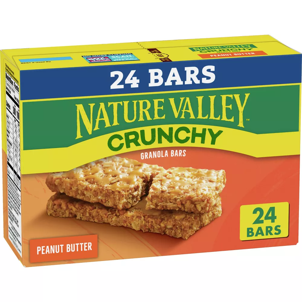The Original Crunch. Nature Valley Peanut Butter Crunchy Granola Bars are a tasty snack made with whole-grain oats and creamy peanut butter. A portable snack perfect for the pantry, lunch box, and hiking trail. There are no artificial flavors, colors or high fructose corn syrup, and these snack bars pack an excellent source of whole grains with 20 grams per serving. It’s a breakfast snack bar, an office snack or an on-the-go treat the whole family can enjoy. At Nature Valley, we believe that what you put in is what you get out. So when you need to be great out there, you can rely on us for real energy, wherever and whenever you need it. Energy you can depend on. Includes 12 two-bar pouches, 24 bars total.