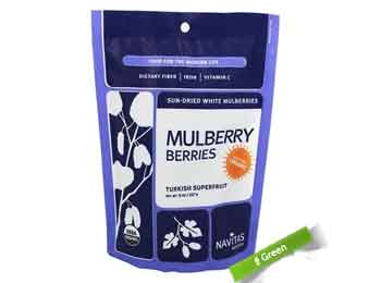 Dried white mulberries are treasured for their unique flavor and texture, and for their antioxidant content. Navitas Naturals Mulberries are akin to a dried fig in flavor and chewiness. Our Turkish mulberries are a satisfying snack, or they can enhance virtually any recipe. Try this sweet superfruit in trail mix, granola, yogurt, smoothies and baked goods.r100% Organic, Yeast Free, Wheat Free, Vegan, Kosher, GMO FreerMade in Turkey/RomaniarDried white mulberries are treasured for their unique flavor and texture, and for their antioxidant