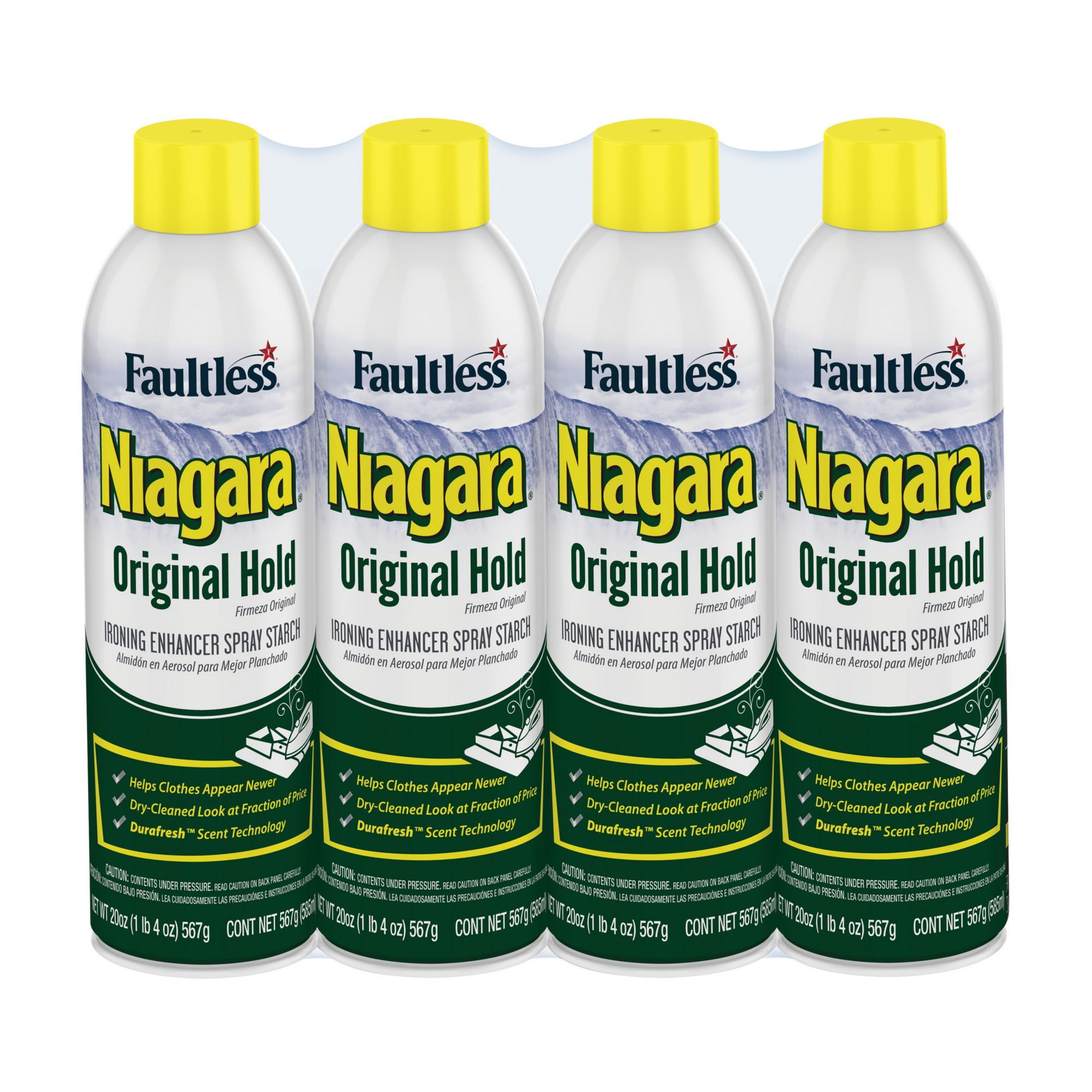 Niagara Spray Starch products are great general use laundry aids for washing and ironing on hanging or just out of the dryer items. Use Niagara Spray Starch to give your clothing a long lasting professional finish. This pack includes four 20 oz. bottles of Niagara Spray Starch. Product Features: Long lasting professional finishA crisp clean look for your clothesRemoves wrinkles while clothes resist wrinklingMakes ironing easierCreases are sharp while fabrics look and feel refreshedWarranty: Proven effective for 3 years from date of manufactureIncludes four count of Niagara Spray Starch (Model 8177)