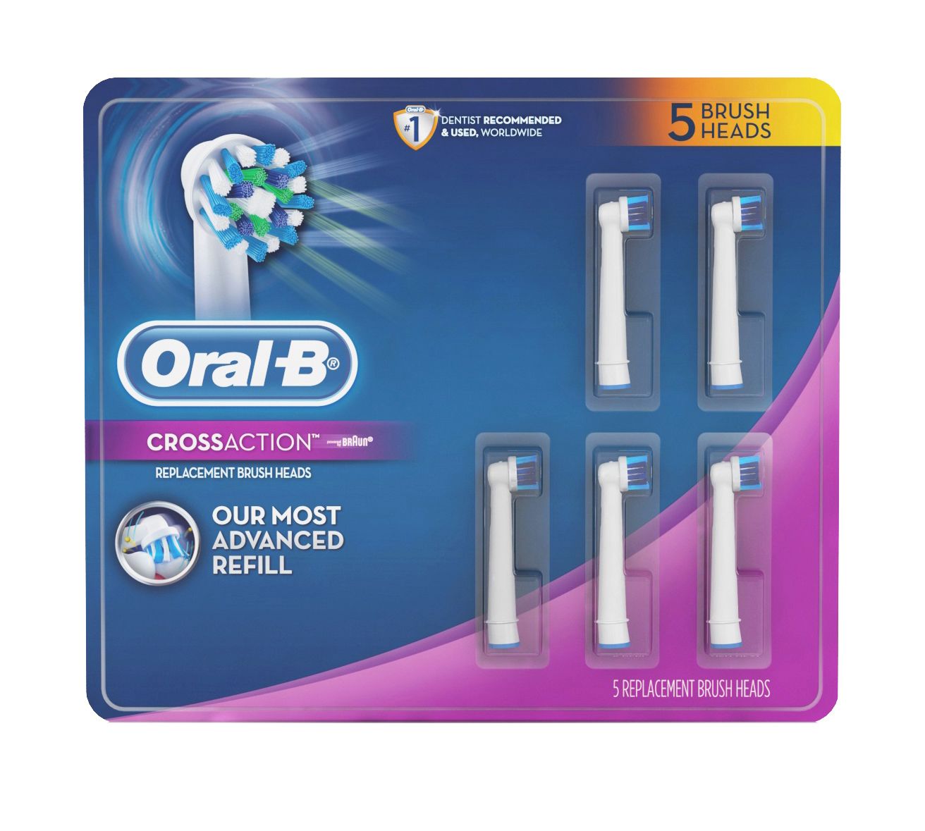 The Oral-B CrossAction replacement toothbrush head features Oral-B’s most advanced technology. It features perfectly angled bristles to remove 100% more plaque for a superior clean vs. a regular manual toothbrush. The round brush head is inspired by dental professional tools for a tooth-by-tooth clean, with specially engineered bristles for optimal tooth coverage. Product Features: Perfectly angled bristles to remove up to 100% more plaque vs. a regular manual toothbrush Round brush head is inspired by dental professional tools for a tooth-by-tooth clean Specially engineered bristles for optimal tooth coverage #1 dentist-used toothbrush brand, worldwide Compatible with the entire lineup of Oral-B rechargeable handles, except for Oral-B sonic toothbrushes Includes 5 replacement brush heads (Model 006905587949)