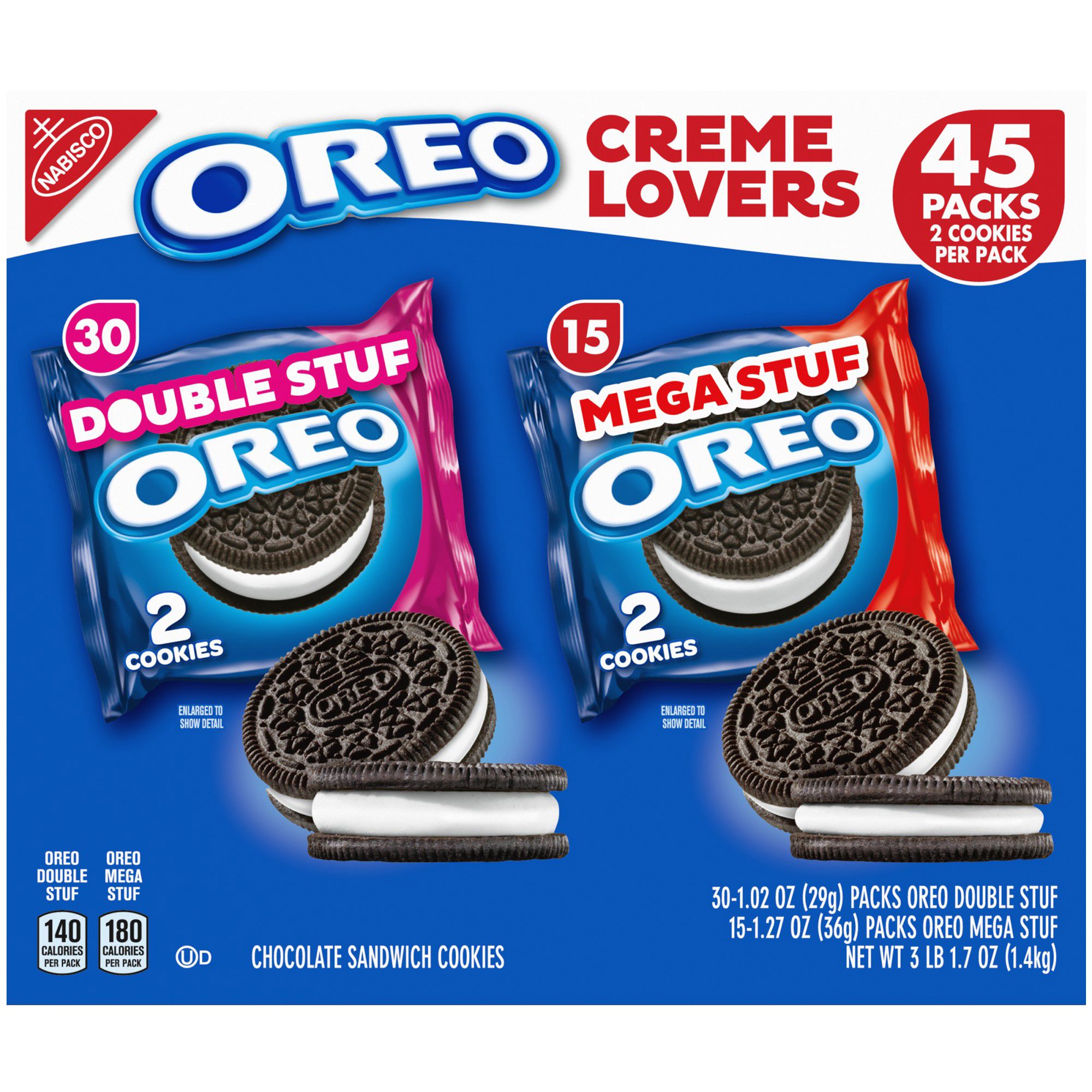 Made in USAOreo Winter Treats contains 45 packs of individually wrapped Oreo cookies. Perfect for adults and kids, 30 packs of Oreo Double Stuf cookies is an everyday favorite. The 15 packs of Mega Stuf gives even more of that crème everyone craves. Product Features: Individually wrapped cookiesMore crème with Double StufMEGA Stuf includedClub size…