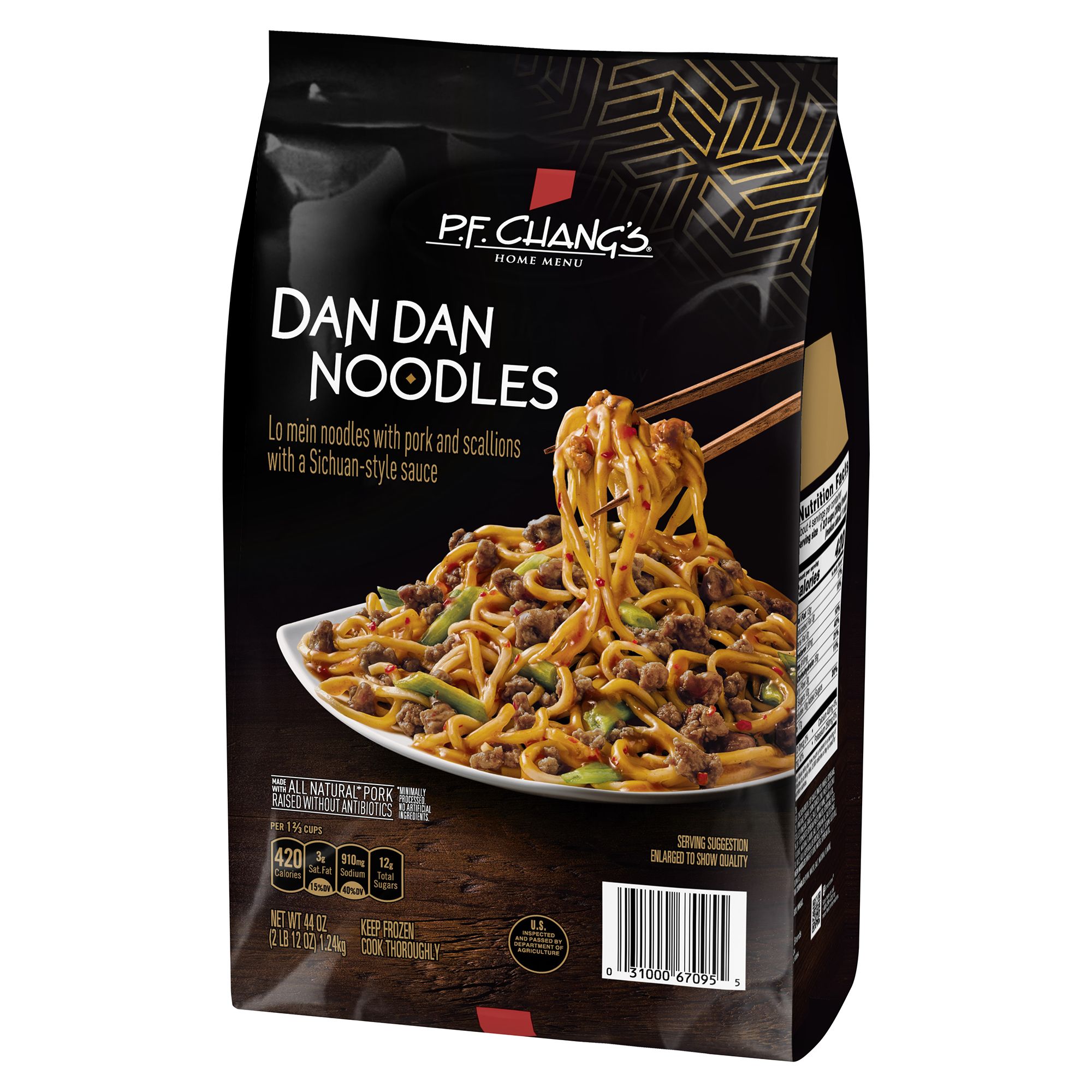 Made in USASimple, yet bold, P.F. Chang’s Home Menu Dan Dan Noodles Skillet Meal delivers a flavorful combination of lo mein noodles, all-natural pork and scallions coated in a savory, Sichuan-style sauce. Easy to prepare on your stovetop, each package of dan dan noodles comes with four servings, making it perfect for a quick weeknight dinner. P.F. Chang’s Home Menu Dan Dan Noodles Frozen Meals are made with no preservatives, no artificial flavors and no artificial colors. With P.F. Chang’s Home Menu product line, you can bring the taste of your favorite Asian restaurant to your kitchen table. Product Features: Dan dan noodles multiserve skillet meal Frozen meals for fast weeknight dinners Convenient 44 oz family size skillet Bold flavors within family size meal Ingredients: Sauce (Water, Chicken Broth, Soy Sauce [Water, Wheat, Soybeans, Salt, Alcohol, Vinegar], Sugar, Corn Starch, Chili Paste [Red Chili Peppers, Distilled Vinegar, Garlic, Salt], White Wine, Canola Oil, Less Than 2% Of: Fermented Soybean Paste [Water, Soybeans, Rice, Salt, Wheat Flour], Natural Flavor, Salt, Soybean Oil, Salted Sake [Sake {Water, Rice, Koji (Aspergillus Oryzae)}, Salt], Sesame Seed Oil), Cooked Lo Mein Noodles (Wheat Flour, Water, Soybean Oil, Sodium Carbonate), Cooked Pork Crumbles (Pork, Water, Salt, Natural Flavor), Scallions Product Warnings and Restrictions: Contains soy and wheat