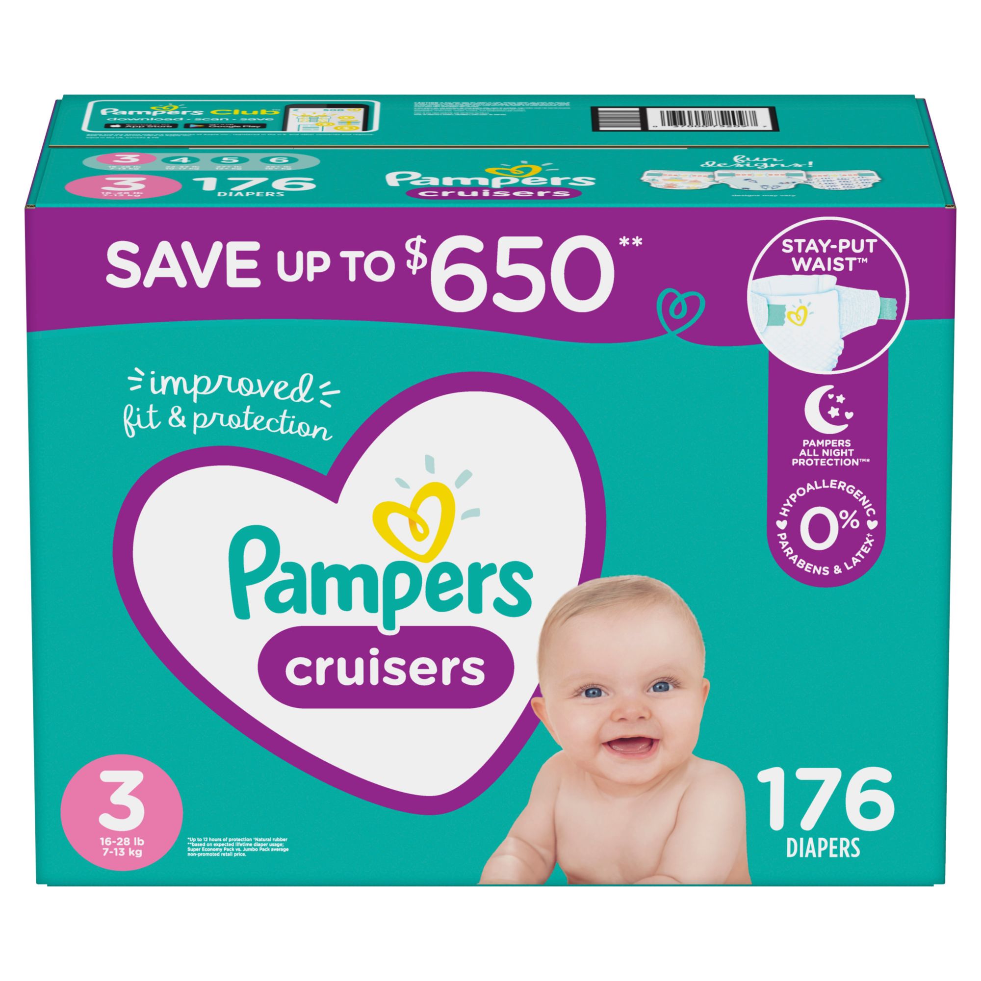 Made in USALong-lasting fit and protection for the most active babies! Pampers Cruisers have 2x stretchier sides* for a comfy, secure fit that stays put, even when they don’t. With new and improved** Dual Leak-Guard Barriers that gently seal around the legs and bottom to stop leaks where they happen most. Cruisers come in a variety of stylish prints, all with trusted Pampers All Night Protection. Plus, Pampers Cruisers are hypoallergenic and free of parabens and latex,*** so they’re gentle on your baby’s skin. Pampers Cruisers diapers are available in sizes 3, 4, 5, 6, and 7. *Vs. The leading moving baby sub-brand **Sizes 3 & 4 ***Natural rubber Product Features: Pampers Cruisers has long-lasting fit and trusted protection for the most active babies2x stretchier sides* for a fit that stays put *Vs. the leading moving baby sub-brandNew and improved* dual leak-guard barriers prevent leaks where they happen most *Sizes 3 & 4Available in a variety of wild and playful printsPampers All Night Protection helps stop leaks for up to 12 hoursFit Guide for a more customized fitMade with hypoallergenic materials, without parabens and latex* *Natural rubber Product Warnings and Restrictions: Keep away from any source of flame. Pampers diapers, like almost any article of clothing, will burn if exposed to flame. To avoid risk of choking on plastic, padding or other materials, do not allow your child to tear the diaper, or handle any loose pieces of the diaper. Discard any torn or unsealed diaper, or any loose pieces of the diaper. To avoid suffocation, keep all plastic bags away from babies and children. If you notice gel-like material on your baby’s skin, don’t be alarmed. This comes from the diaper padding and can be easily removed by wiping your baby’s skin with a soft, dry cloth. (Model 3700075209)From the Manufacturer|Powered by Thank You Is the information in this section helpful? Yes / No Pampers Cruisers Diapers Stay-Put Waist A comfy, secure fit that stays put, even when they don’t. 2x Stretchier Sides Strong grip with 2x stretchier sides for a long-lasting fit. LockAway Channels Absorb wetness and lock it away from skin. Dual Leak-Guard Barriers Gently seal around baby’s legs to protect where leaks happen most. Consumer Videos