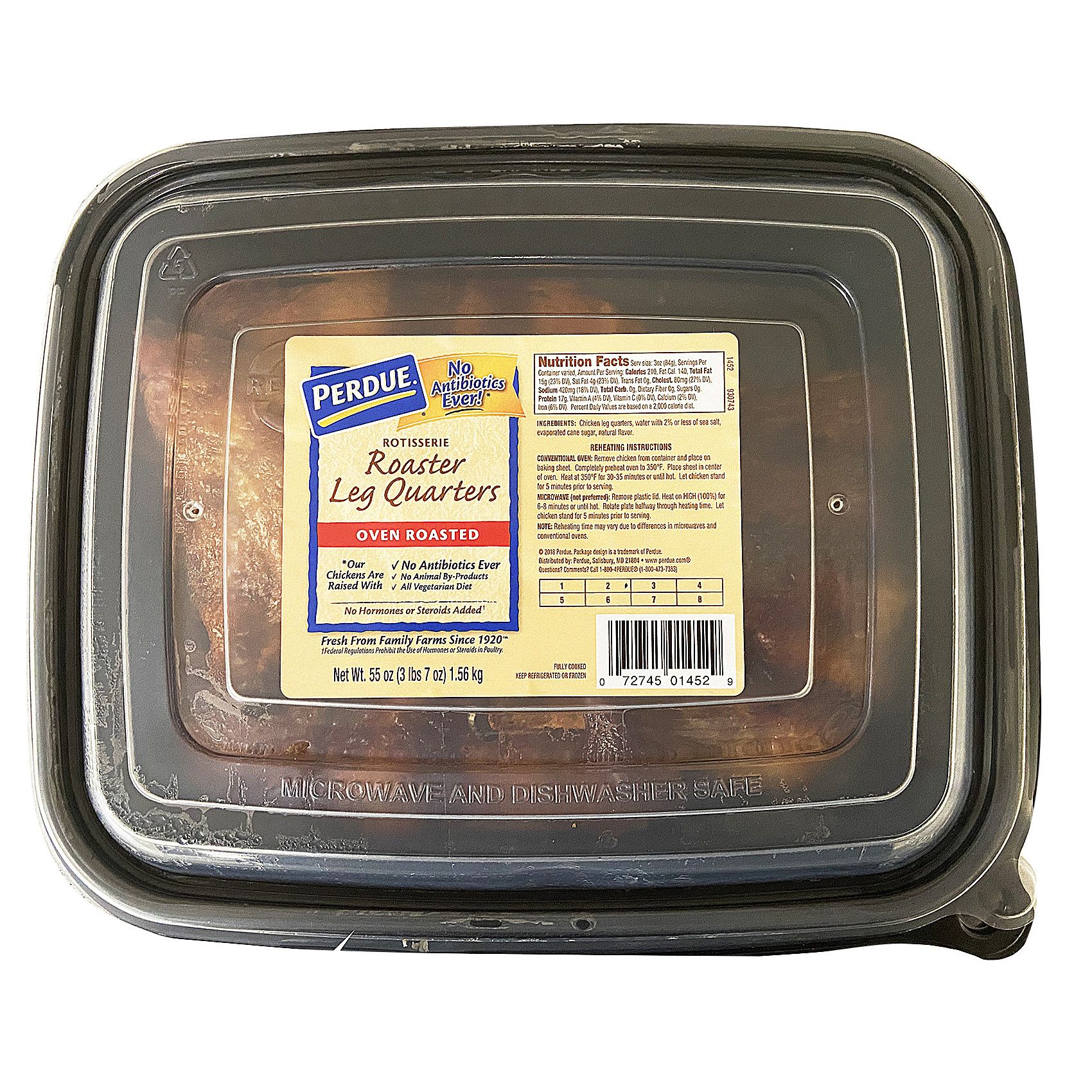Perdue Rotisserie Chicken Leg Quarters is a delicious part of any meal. This chicken is freshly roasted and raised with no antibiotics and are all veggie fed. These leg quarters are seasoned to perfection, perfect for family meal or as a main ingredient in a recipe. Product Features: Freshly cooked on rotisserie Chicken is raised with no antibiotics ever Chicken is fed an all veggie diet Great value for the size of each leg quarter perfect for center of plate meal or for an ingredient for a variety of recipes Ingredients: Chicken Leg Quarters, water with 2% or less of salt, sodium phosphate, dextrose, brown sugar, carrageenan, flavoring