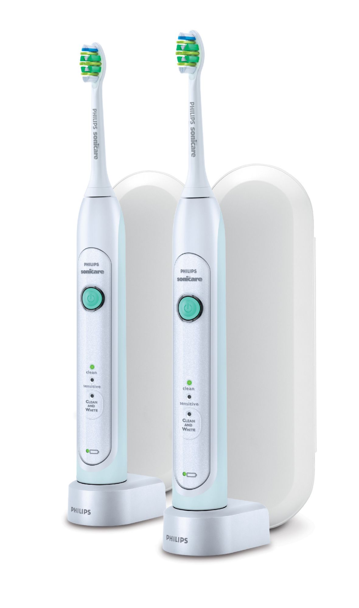The Philips Sonicare Healthy White rechargeable toothbrush removes up to 6 times more plaque than a manual toothbrush for a naturally whiter smile. With up to 31,000 brush strokes per minute, dynamic fluid action helps clean between teeth and along the gumline. Product Features: Removes up to 6x more plaque than a manual toothbrush Patented sonic technology Up to 31,000 brush strokes per minute 3 brushing modes: Clean, Sensitive and Clean & White Clean and White mode includes an additional 30 seconds to brighten and polish teeth Improves gum health in just 2 weeks Quad pacer feature Includes 2 Philips Sonicare Healthy White toothbrush handles, 2 plaque control brush heads, 2 chargers, 2 hard cases Warranty: 1 year (Model HX6732/75)