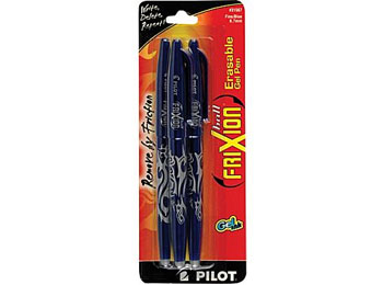 FriXion Erasable Gel Pen allows you to erase and rewrite repeatedly without damaging documents. Thermosensitive, gel ink formula disappears with erasing friction of rubber plug eraser on the pen. Erasing leaves no residue or debris. Pen can write on the same spot that has been erased. Gel/rollerball pen delivers smooth writing gel ink and is not recommended for exposure to extreme temperatures or for signatures, examination papers or official documents where writing needs to remain permanent. Gel pen also earned the prestigious Good Housekeeping Seal. Blue Ink Fine point, 0.7 mm Thermo-sensitive gel ink formula disappears with erasing friction Smooth-writing gel ink Erasable pens are not recommended for use on legal or official documents. Do not expose to extreme temperatures less than 14 degree or greater than 140 degrees fahrenheit If pen is exposed to temperature that reaches 140 degrees the ink will be colorless when writing. To restore color, cool to at least 14 degrees in freezer and the ink will again write in color 3 pens per pack